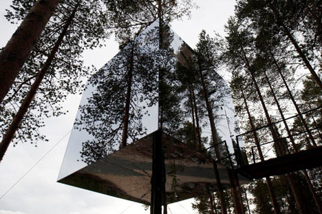 “การอาศัยอยู่อย่างใกล้ชิดกับธรรมชาติ โดยใช้วัสดุสมัยใหม่ให้กลมกลืนกับสภาพแวดล้อม” นี่คือแนวความคิดหลักและเป็นจุดขายที่สำคัญของโรงแรมต้นไม้แห่งนี้ ในป่าเขียวครึ้มที่มีสภาพแวดล้อมอุดมสมบูรณ์ซึ่งอยู่ทางตอนเหนือของประเทศสวีเดน ไม่ไกลจากตัวเมืองฮาราด สถาปนิกออกแบบห้องพักรูปทรงลูกบาศก์ขนาด 4 x 4 x 4 เมตร (กว้าง x ยาว x สูง) กรุด้วยผนังกระจกเงารอบด้าน โครงสร้างอลูมิเนียมเบาแต่แข็งแรง แขวนยึดอยู่กับต้นไม้ กระจกเงาที่กรุเป็นผนังภายนอก สามารถมองผ่านจากด้านในออกไปได้ แต่หากมองจากภายนอก กระจกจะสะท้อนทิวทัศน์ของสิ่งแวดล้อม ป่า และท้องฟ้า ดูกลมกลืนไปกับธรรมชาติ แสดงให้เห็นว่ามนุษย์สามารถใช้วัสดุเทคโนโลยีสมัยใหม่ เพื่ออยู่ร่วมกับธรรมชาติอย่างกลมกลืน เป็นการพลางตัวและแสดงตัวในเวลาเดียวกัน