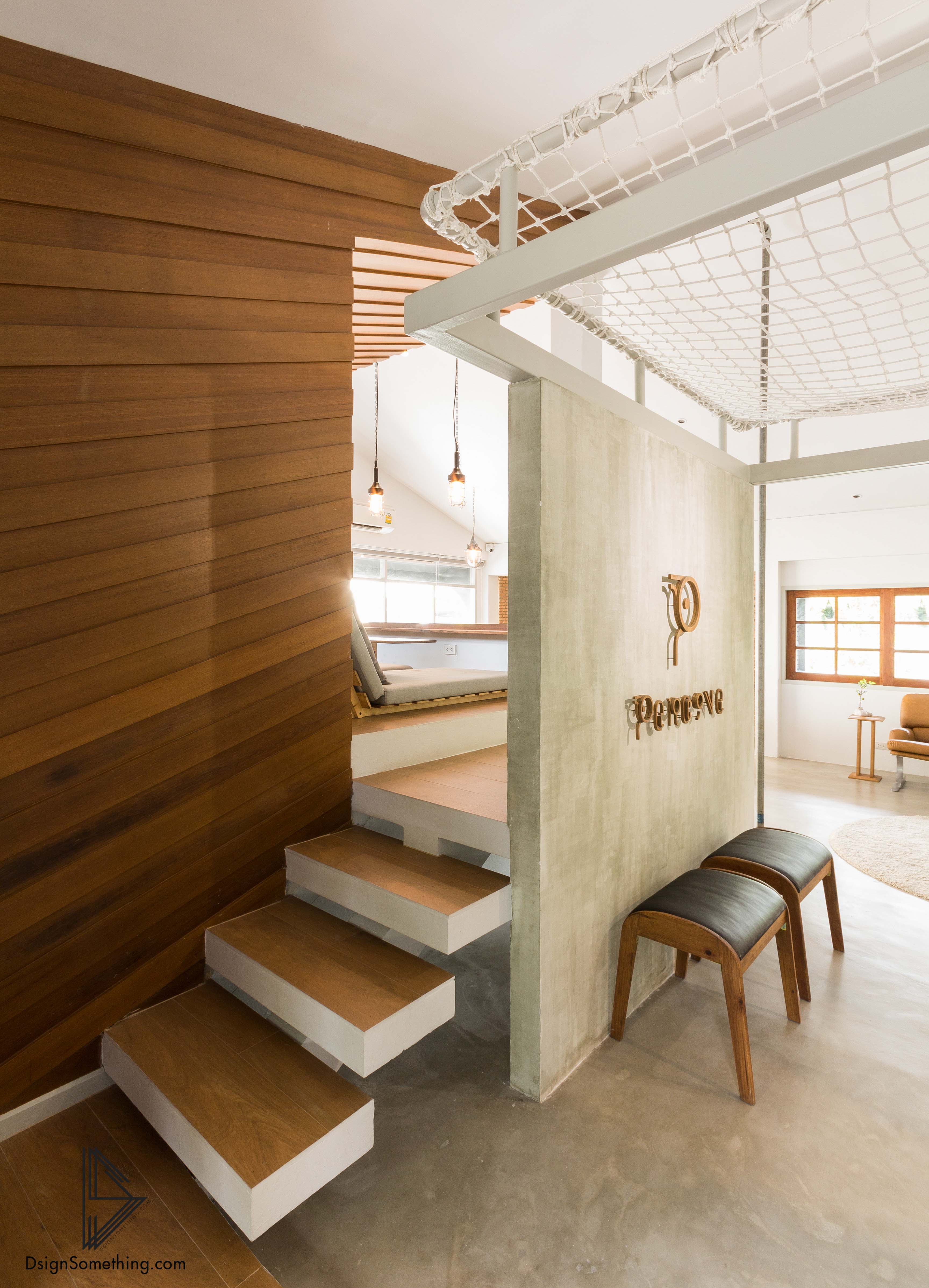 โครงสร้างรับนำหนักหลักของอาคารยังคงรูปแบบอยู่ในสภาพดั้งเดิม งานปรับปรุงอาคารจะเน้นเรื่องการวางระบบอาคารสำหรับการใช้งานให้เหมาะกับจำนวนคนที่เข้ามามากขึ้น ออกแบบตกแต่งภายในและจัดวางเฟอร์นิเจอร์ส่วนใหญ่โดยฝีมือเจ้าของโครงการเอง มีเก้าอี้ชายหาดให้นอนเอนทำงานแบบสบาย ๆ มีโต๊ะไม้พับเก็บได้ที่ออกแบบขึ้นมาเองเผื่อการขยายพื้นที่ใช้สอย มีเปลนอนห้อยตัวอยู่กลางอากาศ ต้องการสร้างสภาพแวดล้อมที่ดูไม่เคร่งครัด ไม่ยึดติดว่าจะต้องนั่งทำงานกับโต๊ะและเก้าอี้ อยู่ในท่าเดิมตลอดเวลา อยากจะสร้างมุมพักผ่อนเล็ก ๆ สำหรับให้ดีไซเนอร์ได้ผ่อนคลาย เปิดรับแรงบันดาลใจจากพื้นที่ใหม่ ๆ