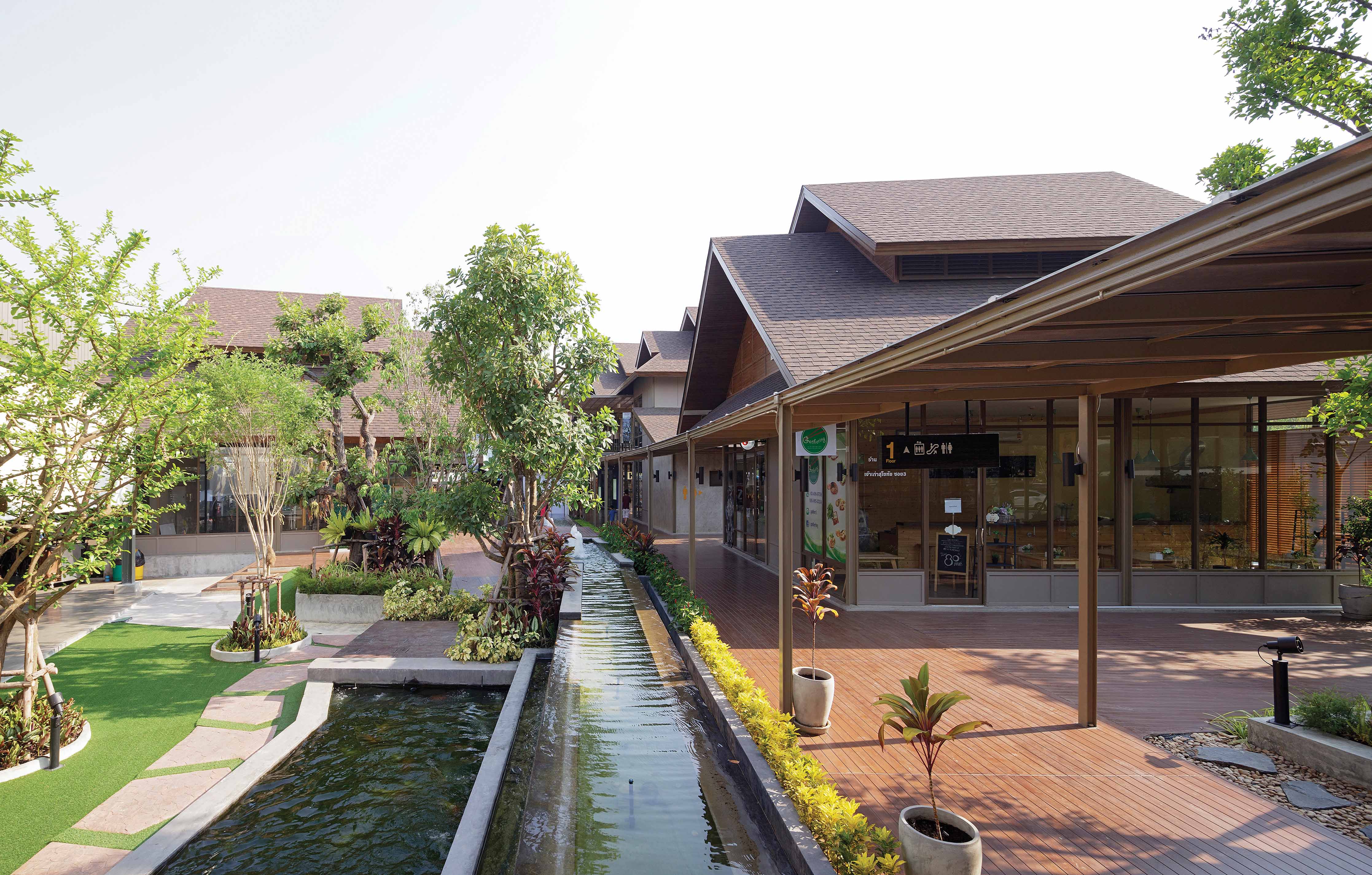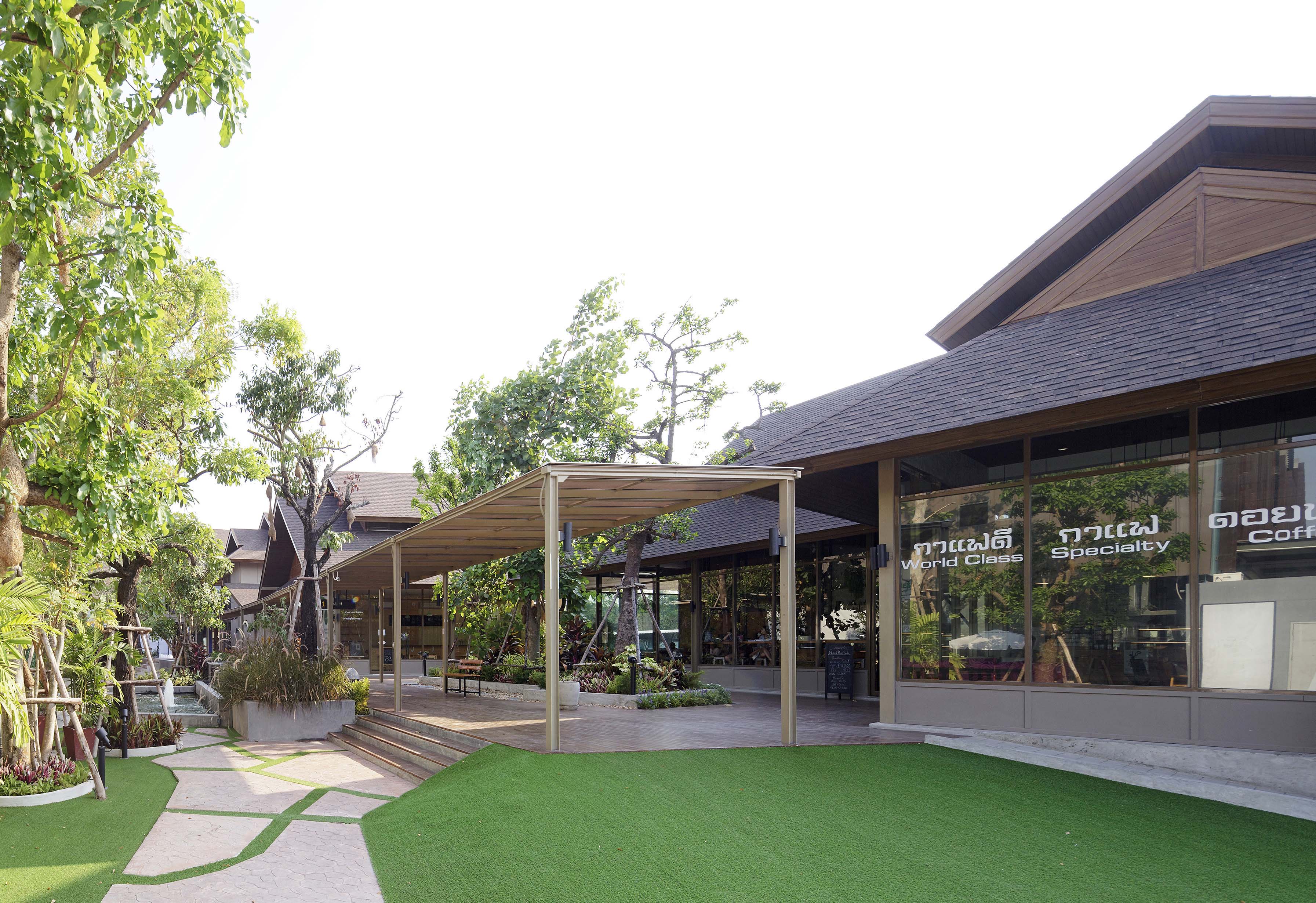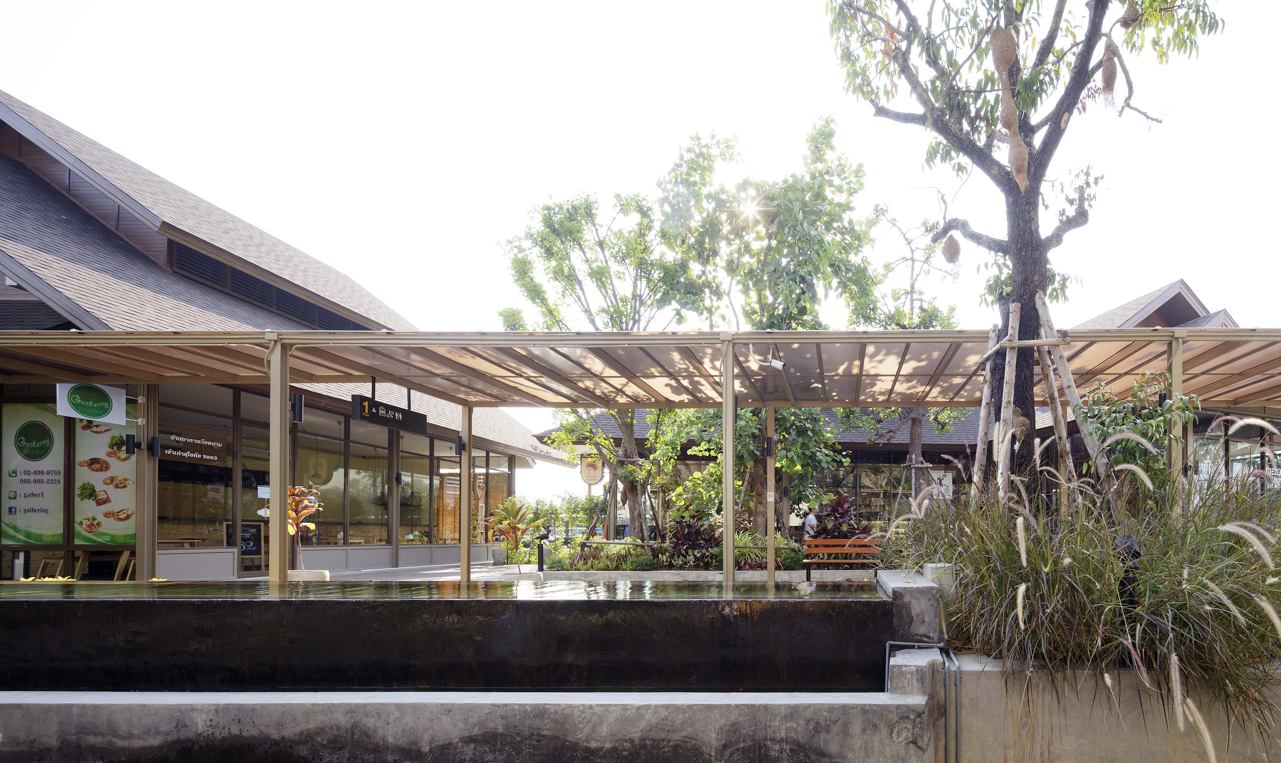 สถาปนิกคือ I Like Design Studio โดยคุณ ณฤชา คูวัฒนาภาศิริ เล่าให้เราฟังว่า “รูปด้านของอาคารถูกพัฒนารูปแบบมาจาก กลุ่มบ้านเรือนของชาวนาที่บ้านโอบล้อมพื้นที่สวนหรือเกษตรกรรม ซึ่งเป็นรูปแบบอาคารบ้านเรือนที่พบได้ทั่วไปในชนบท โดยมีลักษณะเป็นอาคาร 1 – 2 ชั้น หลังคาจั่ว มีชายคายื่นยาว มีการออกแบบส่วนช่องเปิดหรือประตูหน้าต่างที่เปิดกว้าง หรือเปิดโล่งทั้งอาคาร อีกทั้งยังพยายามออกแบบให้กลมกลืน และสอดคล้องกับอาคารตลาดสด (เฟส 1) ที่พัฒนารูปแบบมาจากรูปด้านของโรงนา เพื่อสื่อให้เข้าใจถึงจุดเด่นของโครงการที่เน้นการขายอาหารเป็นหลัก”