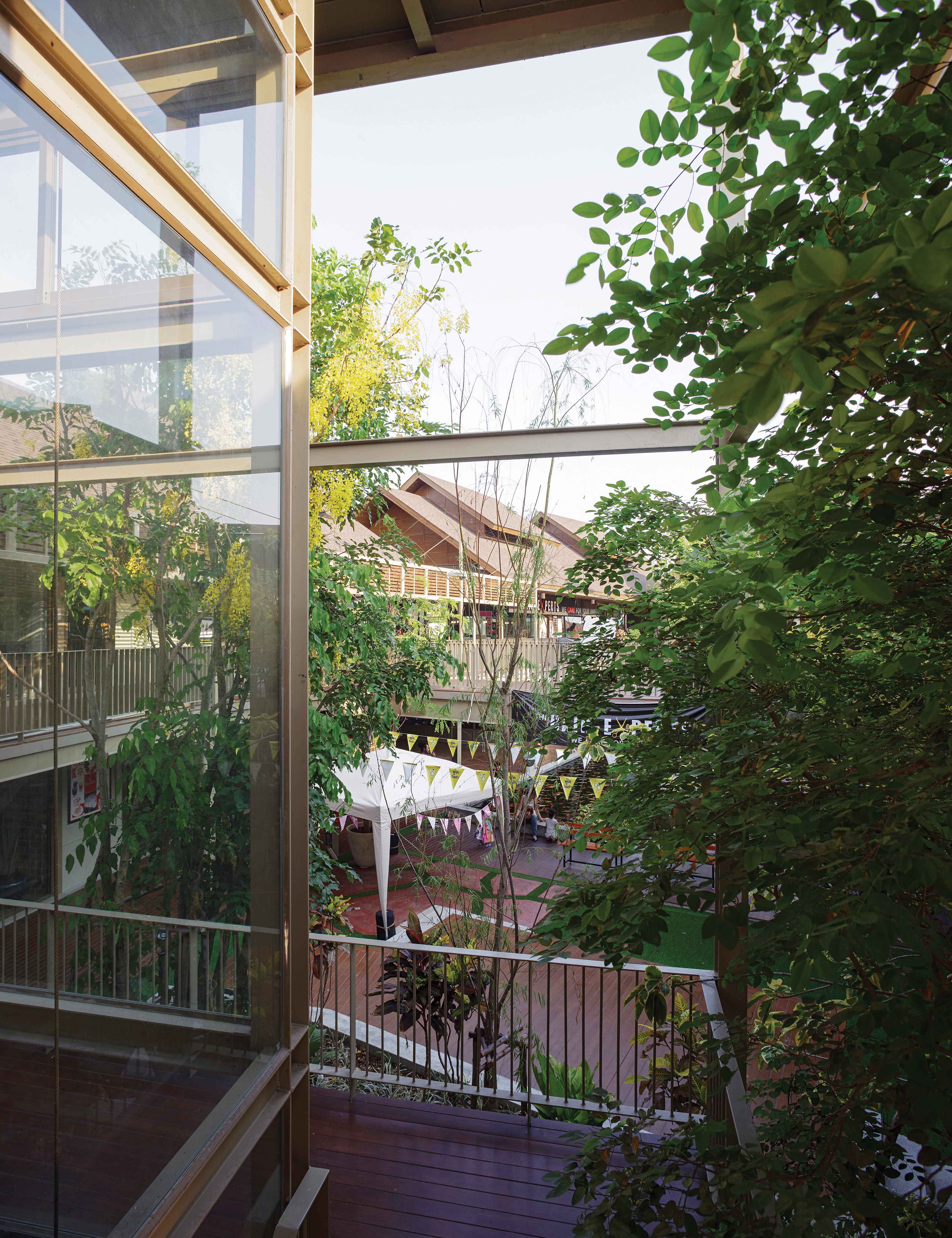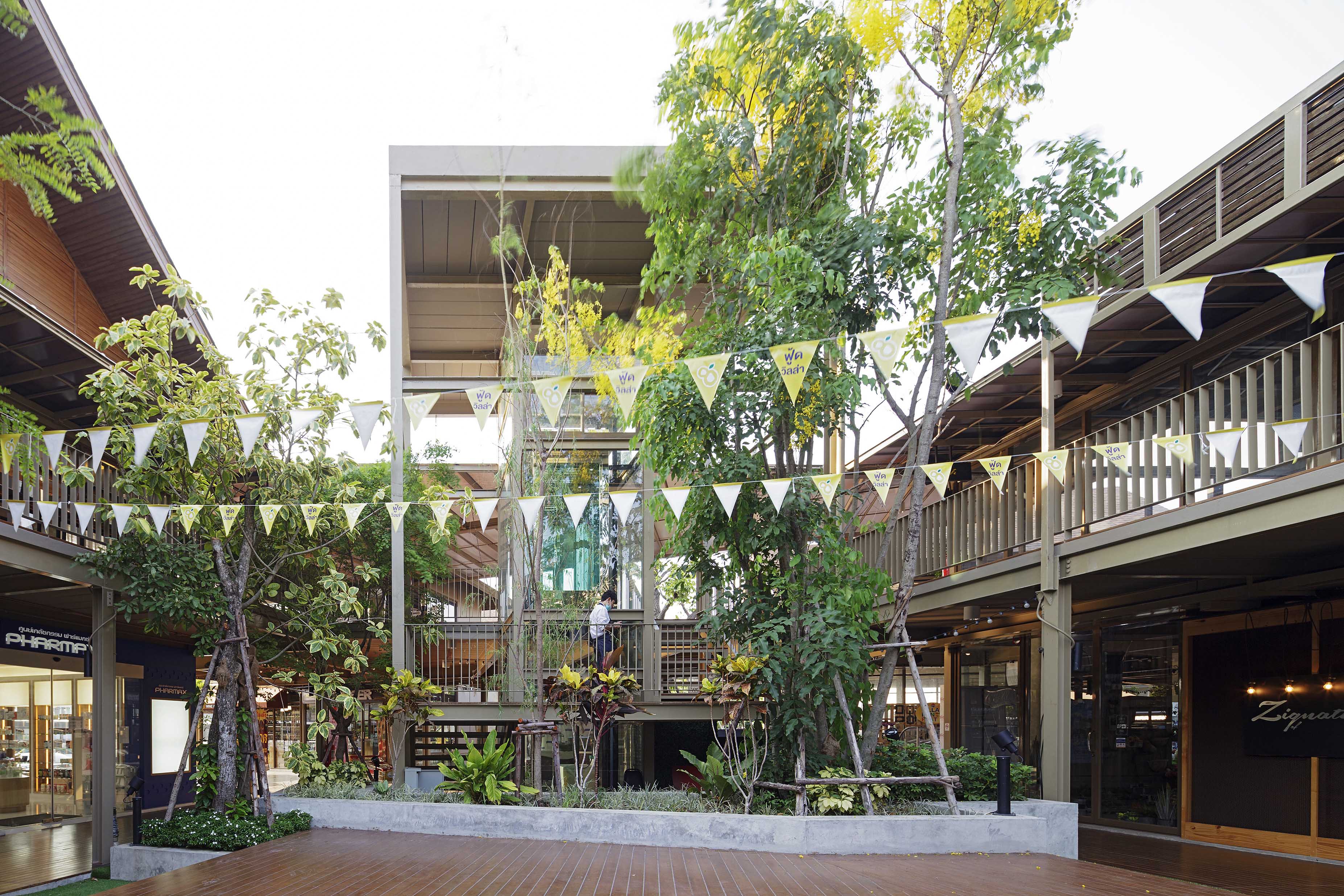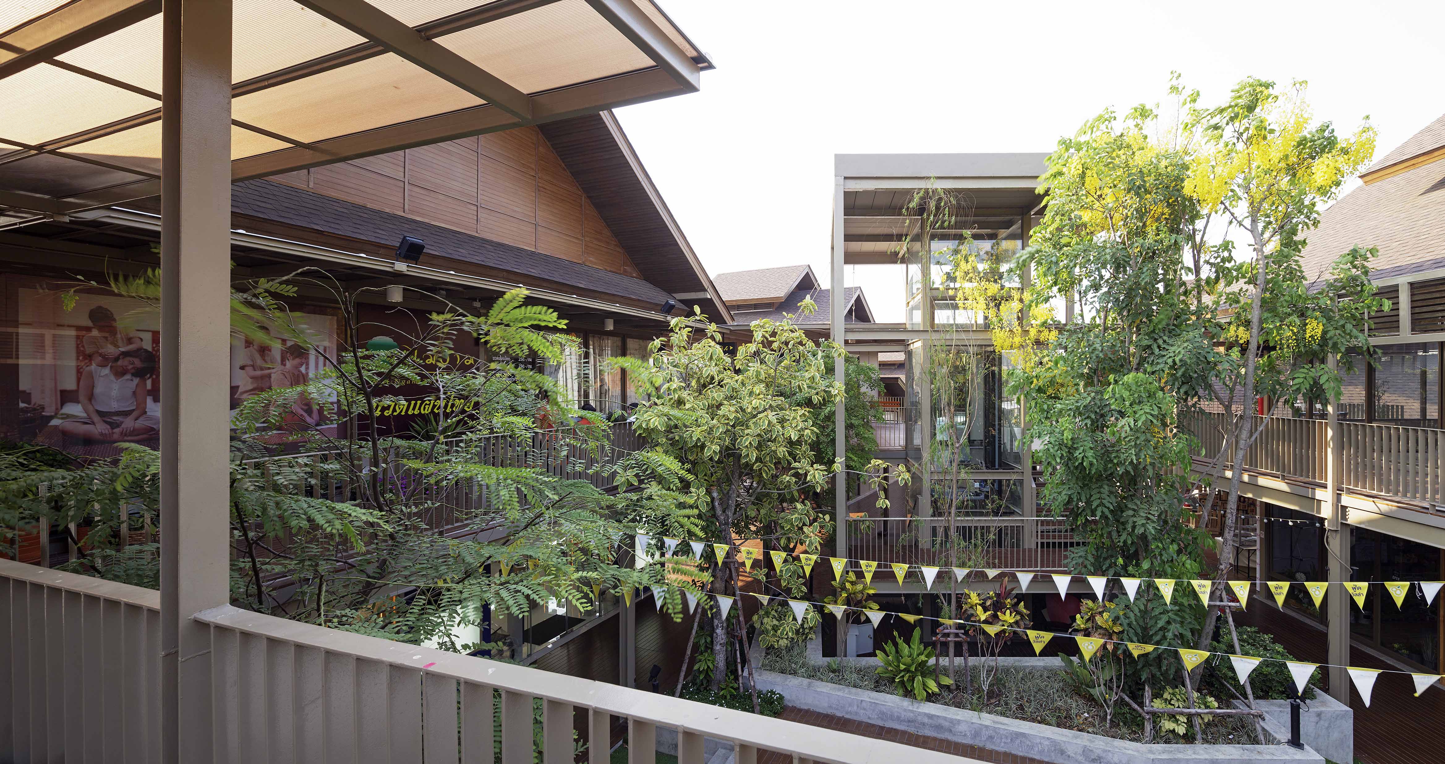 การวางกลุ่มของอาคาร ถูกแบ่งพื้นที่ออกเป็น 2 ส่วน คือ กลุ่มอาคารสูง 1 ชั้น ออกแบบโดยเน้นพื้นที่เปิดโล่งให้เป็นสวนและบ่อปลา เพื่อเป็นการเปิดมุมมองเป็นจุดพักผ่อนและเป็นการเชื่อมต่อพื้นที่กับบริเวณ Food court ของอาคารตลาดสด , กลุ่มอาคารสูง 2 ชั้น ออกแบบอาคารโอบล้อมพื้นที่สวน บ่อปลา ลานกิจกรรมและเวที บริเวณนี้เป็นคอร์ทหลักของอาคาร โดยมีแกนเส้นทางสัญจรคอยแบ่งพื้นที่ของกลุ่มอาคาร และเชื่อมต่ออาคารหลักของโครงการแต่ละส่วนเข้าหากัน