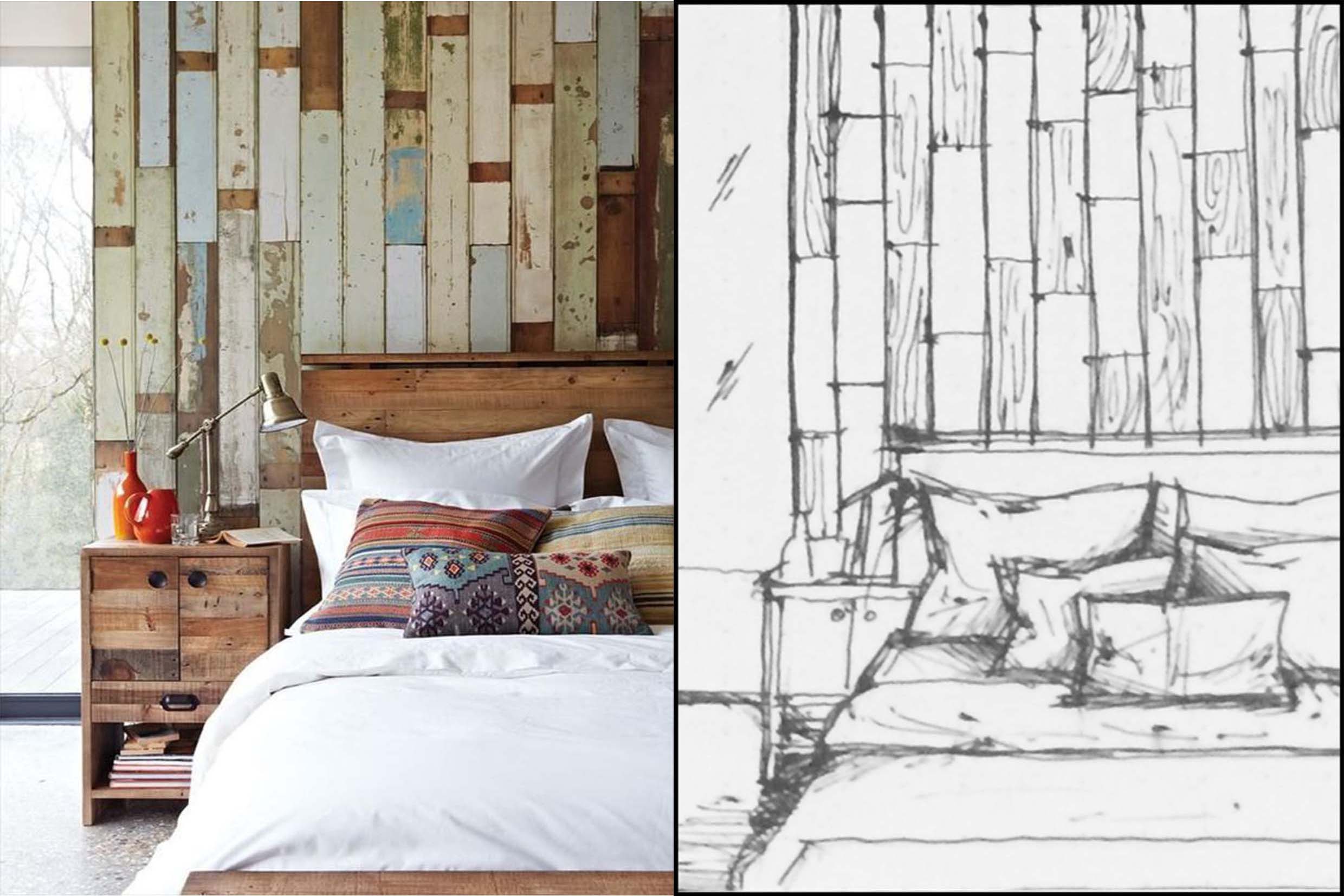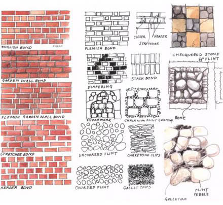 ในรูปด้าน จะแสดงสัญลักษณ์เป็นลาย texture ของวัสดุนั้นๆ เช่น หากผนังเป็นไม้ ก็จะเห็นเป็นลายวงปีของเนื้อไม้