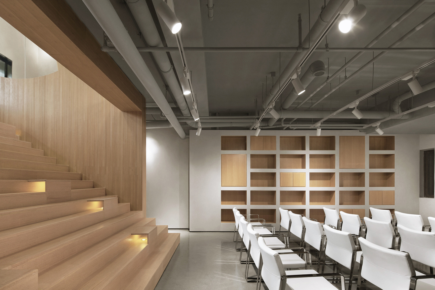 ภายในอาคารได้เลือกใช้สีในโทน Neutral สร้างบรรยากาศให้รู้สึกอบอุ่น ดูสบายตา ได้แบ่งที่นั่งออกเปน 2 ส่วน คือที่นั่งแบบสโลปขั้นบันได และเก้าอี้นั่งปกติ