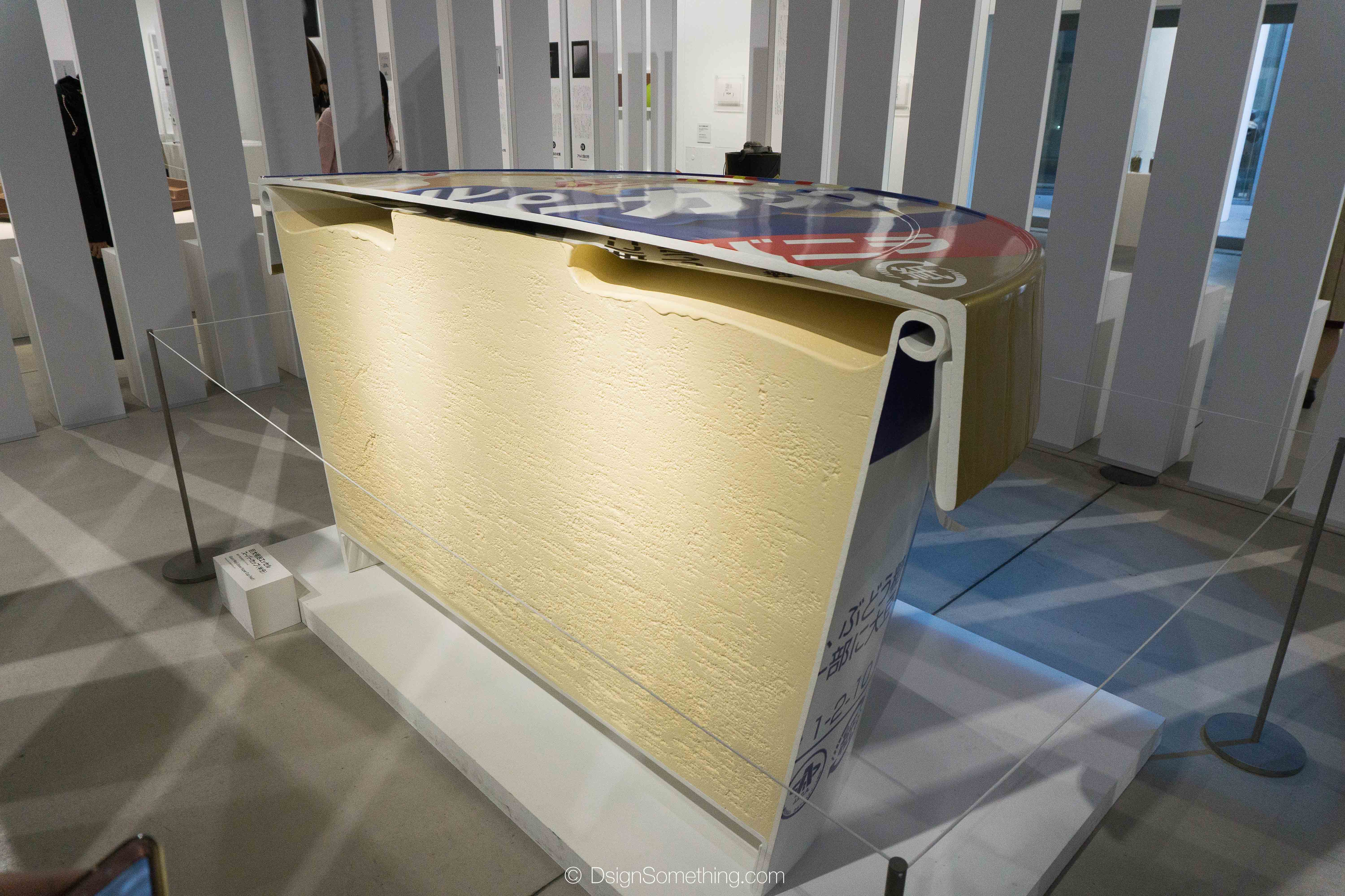 หากเดินเข้ามาภายในอาคารฝั่งขวาจะพบกับเคานเตอร์ขายบัตรเข้าชมงาน และร้านขายของที่ระลึก และเมื่อเดินลงบันไดมาถึงชั้นใต้ดิน จะพบกับคอร์ทสามเหลี่ยมที่ทำหน้าแบ่งส่วนจัดแสดงออกเป็น 2 ห้อง และในช่วงที่เราไปนั้น ก็กำลังจัดแสดงงานในหัวข้อ “Design Anatomy” ซึ่งนำเสนอเรื่องราวการดีไซน์ของผลิตภัณฑ์ที่เราใช้ในชีวิตประวัน ผ่านมุมมองของ Taku Satoh กราฟิกดีไซน์เนอร์ที่มีประสบการณ์การทำงานในบริษัทเมจิ (Meiji) มากว่า 15 ปี โดยเขาได้ยกตัวอย่างเป็นผลิตภัณฑ์ตัวดังๆ ของบริษัทเมจิอย่าง ขนมรูปเห็ดเคลือบช็อคโกแล็ต Kinoko no Yama , Meiji Bulgaria Yogurt , Meiji Essel Super Cup และ Meiji Milk Chocolate มาใช้ในการอธิบาย