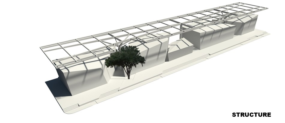 ด้วยแนวคิดที่ชัดเจนเรื่องรูปทรงของอาคาร ทำให้ระบบโครงสร้างนั้นต้องออกแบบมาเป็นพิเศษ และมีรายละเอียดที่ต่างจากอาคารทั่วๆไป นั่นก็คือส่วนของหลังคาที่มีแนวคิดมาจากต้นไม้ใหญ่ และเพื่อให้เสาของโครงสร้างหลังคานี้ไม่ไปอยู่ที่กลางห้องของร้านค้าใดร้านหนึ่ง จำนวนของเสาจึงมีเพียง 3 ต้น อยู่ในตำแหน่งช่องว่างทางเดินระหว่างก้อนอาคารทั้ง 4
