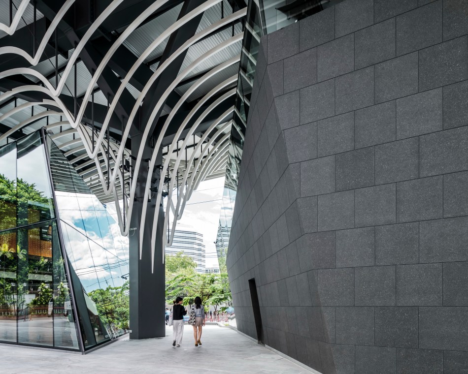 “พื้นที่การใช้งานอาจไม่ได้พิเศษอะไร แต่ด้วยที่ตั้งของอาคารนี้ ตั้งอยู่บนถนนวิทยุที่อยู่ใจกลางเมือง และติดถนนใหญ่ การออกแบบรูปทรงจึงสำคัญ โดยได้รับโจทย์เรื่องการเป็นอาคารไอคอนของถนนสายนี้ ในขณะเดียวกันการออกแบบยังต้องคิดถึงอาคารเดิม (Sindhorn Building) จึงออกแบบตัวอาคารใหม่ไม่ให้บดบังทางเข้า แถมยังเอื้อให้ตัวอาคารและทางเข้าเดิมมีความน่าสนใจมากขึ้น โดยการตัด คว้าน เส้นแนวการเดินเดิม เพิ่มทางเข้าที่น่าสนใจ เกิดแนวแกนพุ่งหาอาคารด้วยนั่นเอง” สถาปนิกพูดถึงการจัดวางพื้นที่และเส้นสายที่เกิดขึ้น
