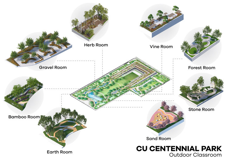ห้องเรียนกลางแจ้งที่ถูกออกแบบมาเพื่อสนับสนุนการเรียนรู้นอกห้องเรียน ของเหล่านิสิตจุฬาฯ และคนในชุมชนโดยมีทั้งหมด 8 ห้องเรียนกระจายอยู่รอบนอกสวน ซึ่งแนวคิดการออกแบบในแต่ละห้องจะแตกต่างกันไป เช่น Herb Room ที่ปลูกสมุนไพรโดยให้ทุกคนเข้ามาช่วยกันดูแลได้อย่างอิสระ และ Earth Room ที่นั่งก่อจากดินหลายสีจากพื้นที่ต่างๆทั่วประเทศ