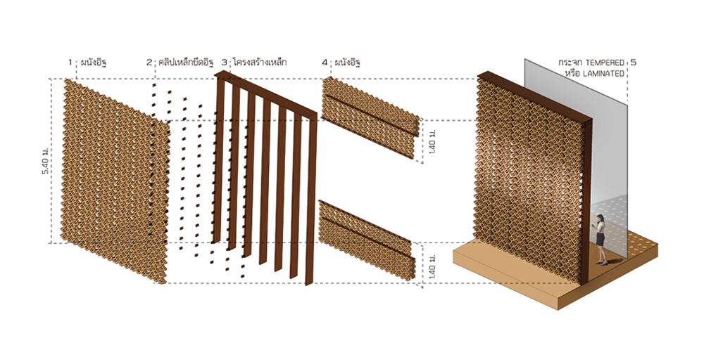 การนำอิฐมาเป็นวัสดุพื้นฐานของอาคารนั้น สะท้อนถึง “จิตวิญญาณของดิน” และประวัติศาสตร์ของพื้นที่ ซึ่งวัสดุมีการผสม “เหล็ก” ซึ่งนอกจากทำให้แข็งแรงและรวดเร็วในการก่อสร้างแล้ว ยังง่ายในการบำรุงรักษา โดยสามารถถอดเปลี่ยนอิฐได้ทุกก้อนทุกตำแหน่งโดยไม่ต้องรื้อทั้งผนัง