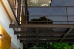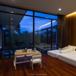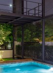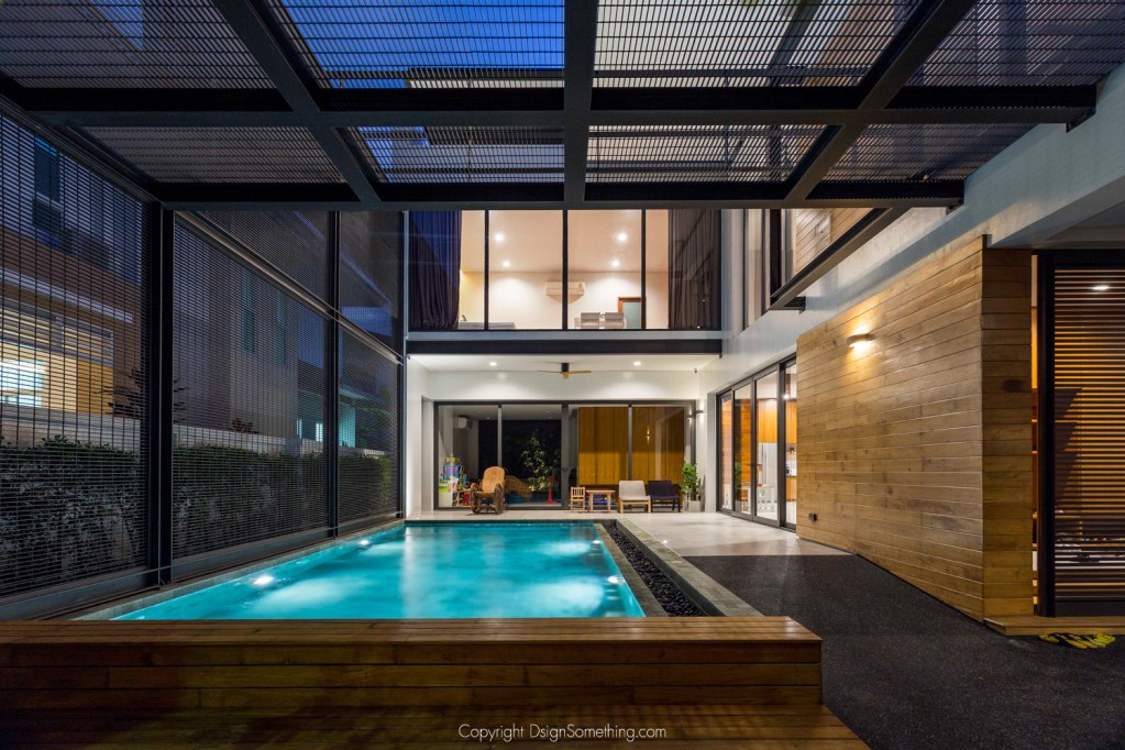 นอกจากนั้นยังมีสระว่ายน้ำที่ยาวไปจนสุดหน้าห้องนอนของบริเวณชั้นล่าง ซึ่งสระน้ำช่วยให้บ้านมีบรรยากาศที่ดูเคลื่อนไหว ไม่หยุดนิ่ง และเพิ่มความร่มรื่นให้พื้นที่ในบ้านได้เป็นอย่างดี จะเห็นได้ว่าบ้านหลังนี้สามารถสัมผัสได้ถึง ดิน น้ำ ลม ไฟ ได้ครบทุกธาตุ ซึ่งธาตุทั้ง 4 อย่างนี้ สามารถสร้างสมดุลและความสงบแก่ผู้อยู่อาศัยได้