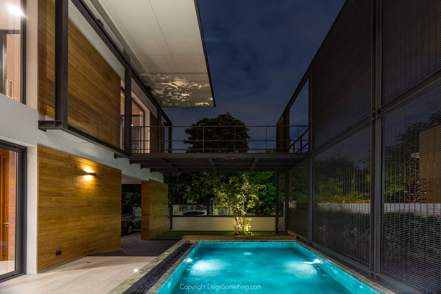 เมื่อมองจากภายนอก จะรู้สึกได้ว่าบ้านมีขนาดใหญ่ เป็นก้อน mass สี่เหลี่ยมก้อนใหญ่ก้อนหนึ่ง สถาปนิกจึงแก้ปัญหาด้วยการใช้ grill มาคลุมบ้านเสมือนผิวอีกชั้นนึง ซึ่งช่วยละลายความเป็น mass ลง และ grill สามารถเปลี่ยนแปลงไปตามแต่ละช่วงเวลาในแต่ละวันได้ เช่นตอนที่มีแสงสว่าง แผงเหล็กนี้จะทำหน้าที่เหมือนแผงบังสายตาจากบุคคลภายนอก แต่ผู้ใช้งานในบ้านยังเห็นข้างนอกบ้านได้อย่างปกติ