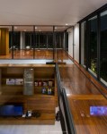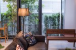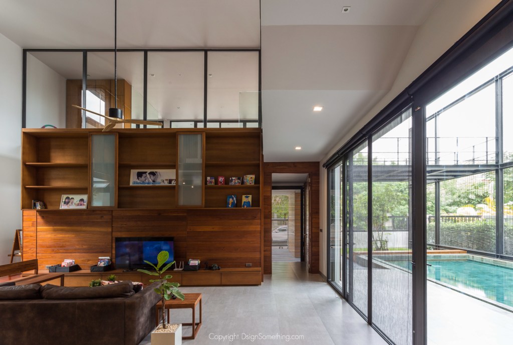 วัสดุในห้องนั่งเล่นจะใช้กระจกเป็นส่วนใหญ่ เพื่อสร้างบรรยากาศภายในห้องให้โล่ง โปร่ง และสามารถมองเห็นบริเวณสระว่ายน้ำได้อย่างทั่วถึง นอกจากนั้นที่ชั้นล่างของบ้านหลังนี้ ยังมีพื้นที่ที่เตรียมไว้สำหรับผู้สูงอายุอีกด้วย เช่นมีทางลาดที่ขึ้นห้องนอนชั้นล่างได้โดยตรง และไม่มีการยกระดับพื้นเพื่อง่ายต่อการใช้งานของผู้สูงอายุ