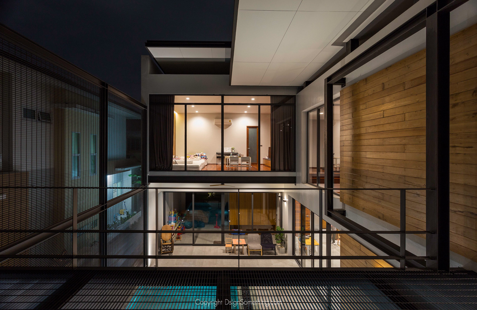 บ้านตั้งอยู่ในหมู่บ้านจัดสรร ซึ่งมีความเป็นส่วนตัวค่อนข้างน้อย สถาปนิกจึงออกแบบ grill ซึ่งเปรียบเสมือนผิวชั้นนอกสุดของบ้าน เพื่อช่วยพรางตาให้บ้านมีความเป็นส่วนตัวมากขึ้น นอกจากนั้นยังสามารถบังแดดและระบายอากาศได้อีกด้วย เพราะ grill ไม่ได้ปิดทึบ แต่มีช่องเล็กๆซึ่งลมพัดผ่านได้ หน้าที่ของ grill จึงเหมือนที่ควบคุมปริมาณแสงและลมให้เข้าบ้านได้อย่างเหมาะสมกับการใช้ชีวิตนั่นเอง และในอนาคตส่วนของ grill นี้ สามารถปรับเปลี่ยนให้กลายเป็นพื้นที่สีเขียวของบ้านได้อีกด้วย เช่นนำกระถางต้นไม้มาแขวนไว้กับ grill ในแต่ละช่อง หรือปลูกไม้เลื้อยไต่ขึ้นไปตามผนัง เพื่อความสวยงามและความร่มรื่นของบ้านมากขึ้น