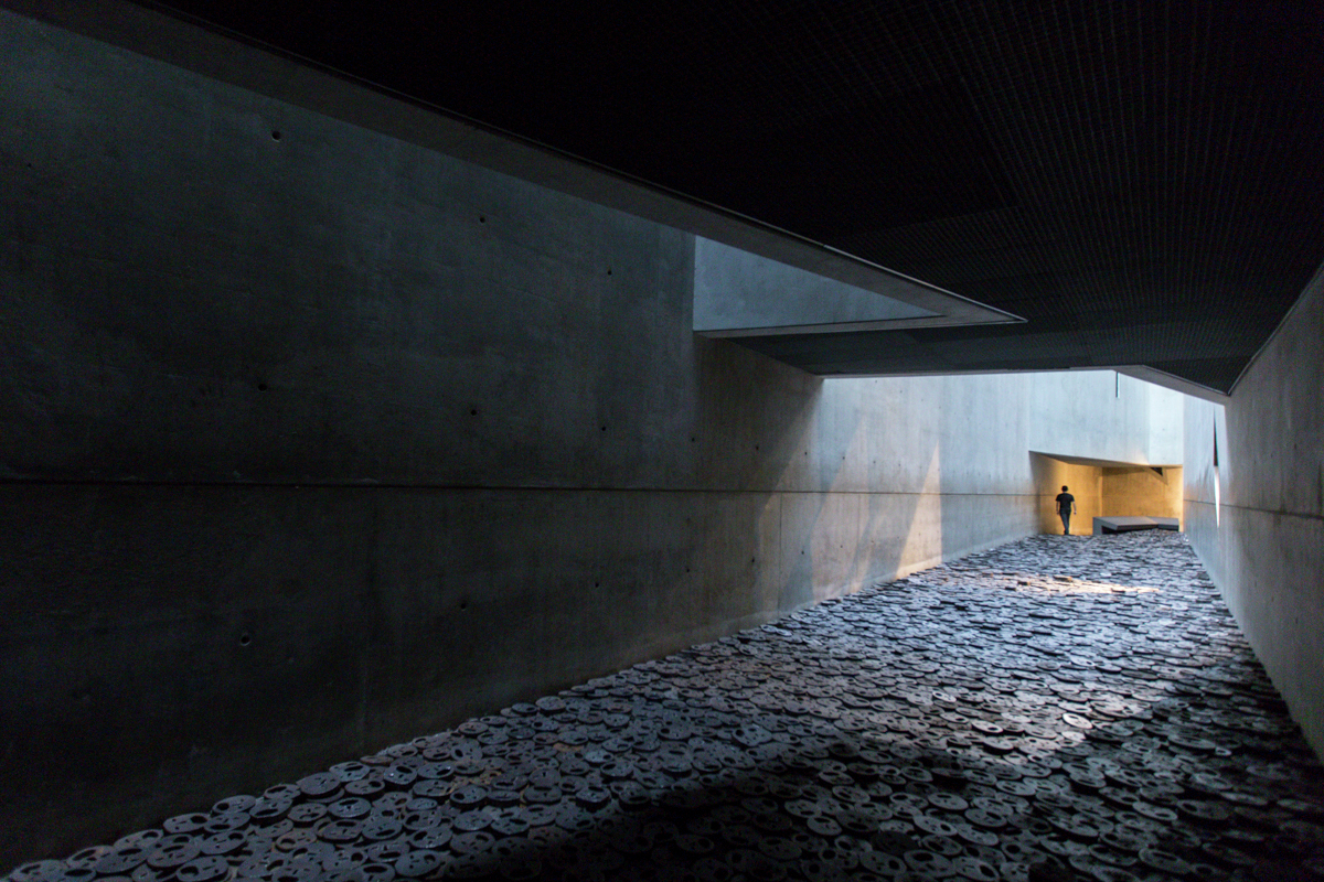 อาคารเป็นรูปร่างซิกแซกไม่มีทางเข้าจากภายนอก มีขั้นตอนการเดินเข้าไปภายในอาคารที่เป็นเฉพาะตัว เสมือนเป็นทางเดินที่ผู้ชมต้องเดินผ่านเข้าไปในช่องว่างใต้ดิน ถึงจะสามารถเข้าชมนิทรรศการได้ การที่เราต้องเดินทะลุอาคารจากทางใต้ดิน ก็คล้ายกับการสมมุติเหตุการณ์ในอดีต ที่ชาวยิวหลบหนีไปตามอุโมงค์ ซ่อนตนเองท่ามกลางความมืด เพื่อให้รอดพ้นจากการไล่ล่าของนาซี เมื่อเราเดินลงไปชั้นใต้ดิน อย่างแรกที่เรารู้สึกคือความมืดและทึบของสถานที่แห่งนี้ ซึ่งต่างจากนิทรรศการทั่วไปที่จะมีการจัดแสงเพื่อสร้างความน่าสนใจของผลงานที่จัดแสดงโชว์ แต่อาคารนี้สถาปนิก มีการเล่นระดับความเข้มความสว่าง ระหว่างแสงและเงา สีเข้มเพราะฉะนั้นในทุกๆที่ภายในอาคาร ไม่ว่าส่วนนั้นจะมีการจัดแสดงงานหรือไม่ก็ตาม ก็จะมีการจัดแสงไฟและความมืด เปรียบดั่งตัวช่วยในการเล่าเรื่องราวมากกว่าที่จะโฟกัสความสนใจของผู้เข้าชมไปแค่จุดใดจุดหนึ่งเท่านั้น