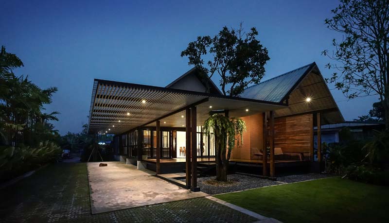 มีแนวต้นหมากเขียวและไม้พุ่มช่วยในการกันแดดให้บ้าน