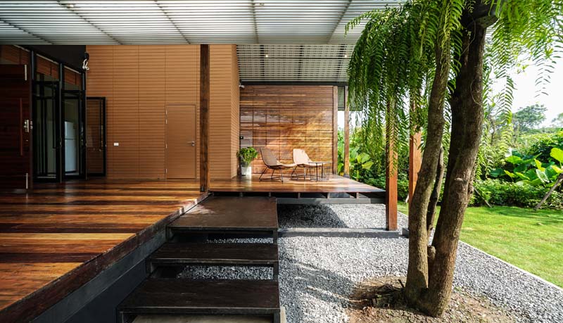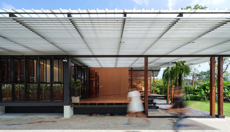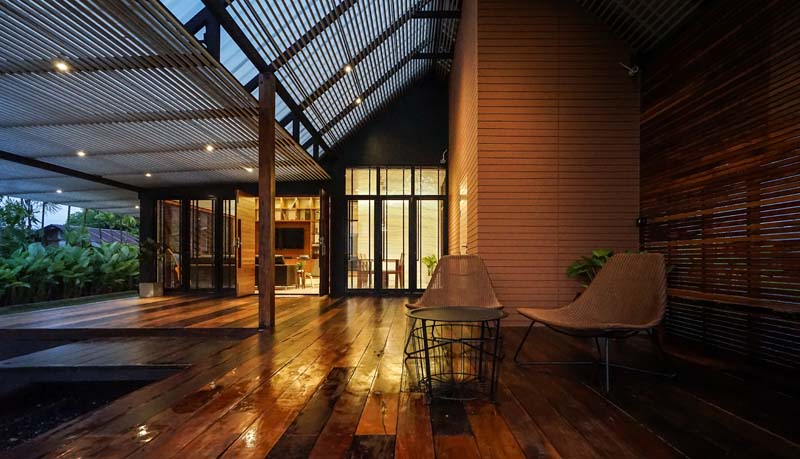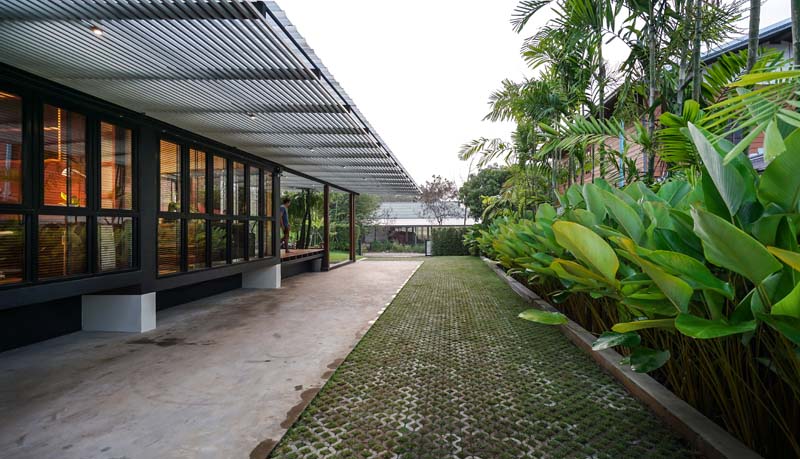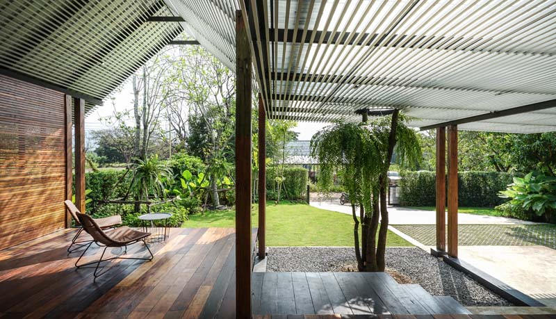 หลังคาที่ใช้เป็นเมทรัลชีทชนิดโปร่งแสง ช่วยเพิ่มความโปร่ง โล่งให้กับพื้นที่ชาน มีการเจาะตรงกลางหลังคาให้ต้นไม้ทะลุขึ้นไป เป็นการสอดแทรกธรรมชาติจากสวนเข้าไปใกล้ชิดกับผู้คนและอาคารมากขึ้น ส่งผลให้ตัวอาคารมีความนุ่ม ละมุน ไม่แข็งกระด้าง และมีระแนงอลูมิเนียมไว้กรองแสงได้เกือบ 70 เปอร์เซนต์ ดังนั้นบริเวณชานเราจะสามารถใช้ได้ทั้งในกลางวันและกลางคืน เสมือนอยู่ใต้ร่มเงาของต้นไม้ นอกจากนั้นด้วยความที่พื้นที่บริเวณนี้เปิดโล่ง จึงทำให้มีลมพัดผ่านตลอดวัน