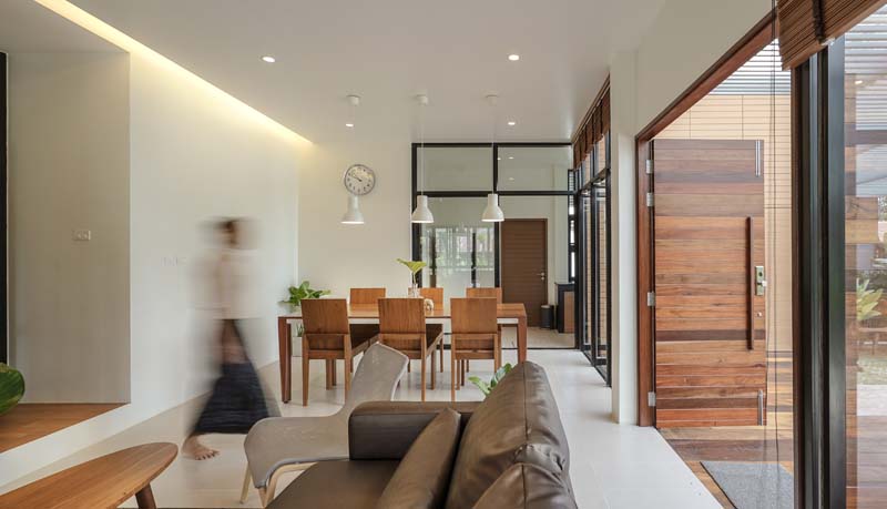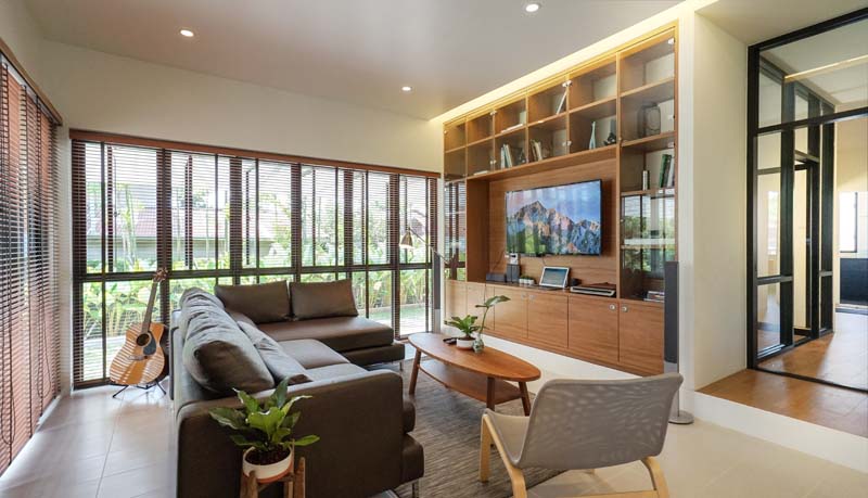 ห้องนั่งเล่นมีการออกแบบแนวรางไฟซ่อนให้เป็นเหมือนกำแพงบางๆ กั้นระหว่างพื้นที่ส่วนตัวและพื้นที่สาธารณะให้เป็นสัดส่วนแยกออกจากกัน ทางเดินหลักกลางบ้านจะเชื่อมต่อไปยังห้องทำงาน ซึ่งมีประตูและหน้าต่างเป็นกระจกใส เพื่อให้ความรู้สึกโปร่งและโล่งในการใช้งาน และแสงธรรมชาติจากหน้าต่างห้องทำงานยังสามารถส่องผ่านมาถึงทางเดิน ช่วยเพิ่มความสว่างและเพิ่มความรู้สึกน่าใช้งานให้กับทางเดินมากยิ่งขึ้น