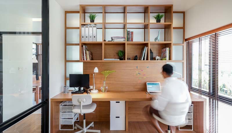 ห้องทำงานสามารถเป็นห้องอเนกประสงค์ของบ้านโฮมบุญ เช่นเป็นห้องทำการบ้านสำหรับลูกๆ เป็นพื้นที่เล่นโยคะ และเป็นห้องนอนสำหรับแขก จากห้องทำงานเมื่อมองไปด้านนอกจะเห็นวิวจากต้นหมากเขียวที่ปลูกเพื่อบังแดด และมีแนวพุ่มไม้ด้านล่างเพื่อเพิ่มความสดชื่นเมื่อมองจากภายในห้อง ดังนั้นแสงธรรมชาติที่เข้ามายังห้องทำงานนั้น จะเป็นแสงที่ถูกกรองมาหลายชั้น ทำให้สามารถเปิดช่องหน้าต่างเพื่อรับลมได้ทั้งวัน โดยไม่ต้องกลัวว่าแสงแดดจะเข้ามาได้ เพราะนอกจากจะมีต้นหมากเขียวแล้วยังมีชายคาที่ยื่นออกไปถึง 3 เมตรไว้กันแดดอีกด้วย