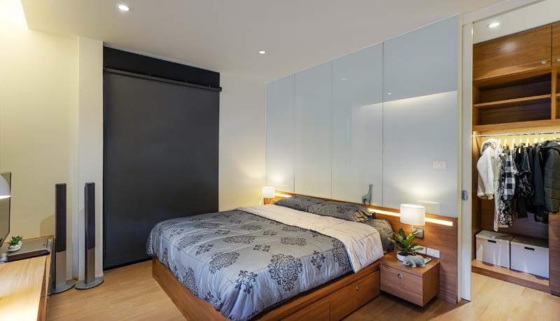แนวคิดของห้อง master bedroom คือความอิสระภายใต้ความอบอุ่น เพราะห้องนอนมีพื้นที่ใช้งานอย่างจำกัดจึงต้องออกแบบให้ผู้ใช้งานไม่รู้สึกอึดอัดเมื่ออยู่ในห้อง สถาปนิกจึงแก้ปัญหาด้วยการตกแต่งหัวเตียงด้วยกระจกสีขาวเพื่อเพิ่มมิติความลึกให้กับห้อง และใช้เฉดสีเข้มในส่วนหลังช่องกระจกช่วยเพิ่มความต่อเนื่องของกระจก ให้ผู้ใช้งานรู้สึกว่าช่องเปิดนั้นสูงจรดเพดาน เจ้าของบ้านจะรู้สึกได้ว่าห้องนอนมีความโปร่ง โล่งและน่าใช้งานมากขึ้น