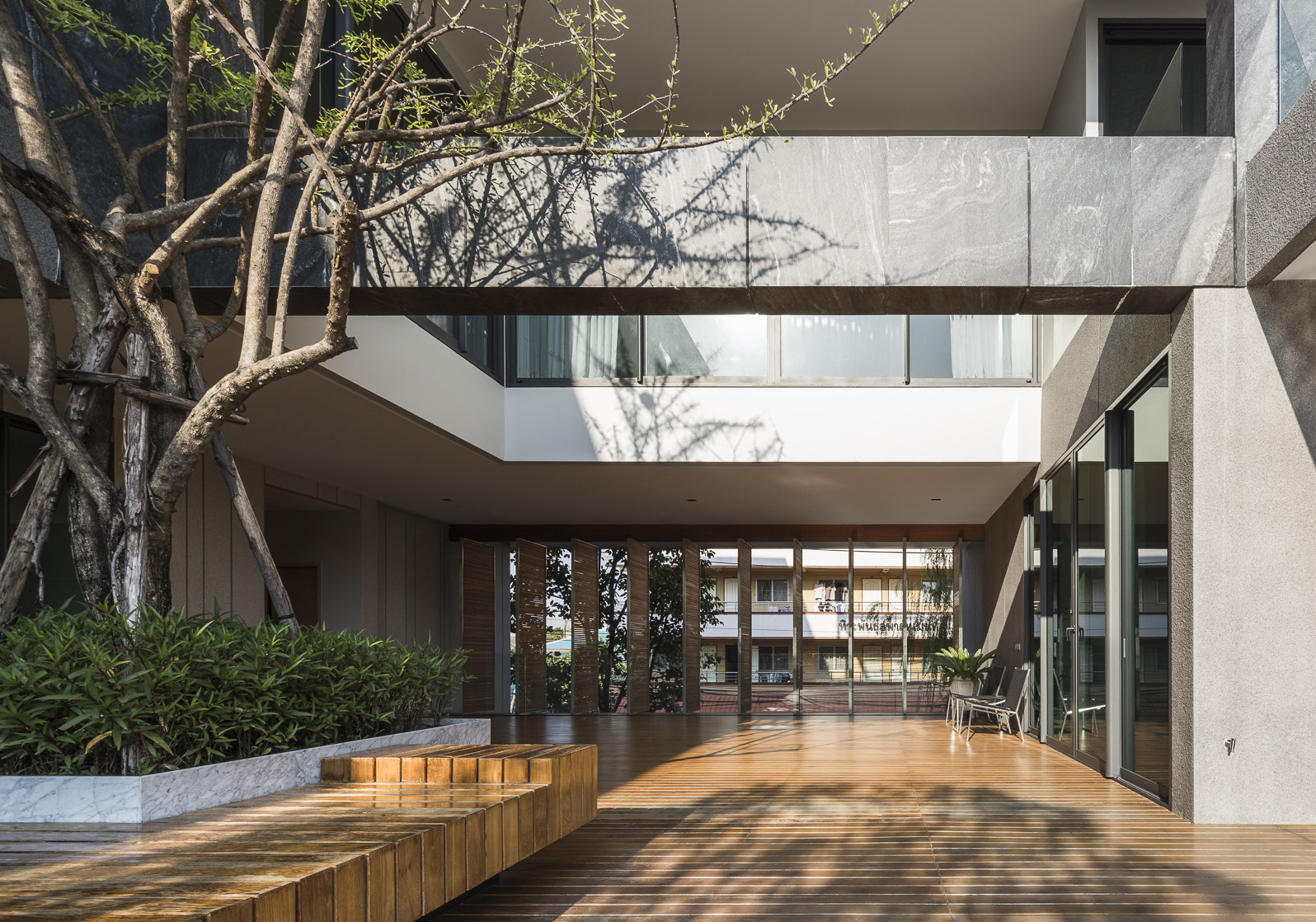 ด้วยพื้นที่ชั้น 1 ประกอบไปด้วยที่จอดรถห้องพักแม่บ้าน ห้องเครื่องสระว่ายน้ำ รวมถึงห้องเซอร์วิสต่าง ๆ ทำให้หัวใจหลักของบ้านและพื้นที่อยู่อาศัยจริงๆเริ่มต้นที่ชั้น 2 ซึ่งพื้นที่ชานแบบไทยๆภายใต้สีเขียวต้นไม้ และสีฟ้าของน้ำในสระว่ายน้ำที่ขนานไปกับตัวบ้านก็อยู่ในชั้นนี้ด้วย ช่วยสร้างบรรยากาศแห่งความร่มรื่นคล้ายบ้านไทยริมน้ำในสมัยก่อนได้เป็นอย่างดี นอกจากนี้ยังทำให้รู้สึกว่าเป็นส่วนตัวมากขึ้นอีกด้วย