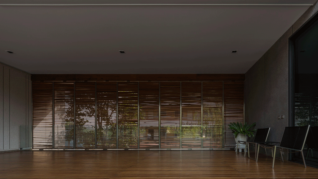 เนื่องจากฝั่งตรงข้ามของบ้าน เป็นอพาร์ทเมนต์ที่มีสูงถึง 4 ชั้น ซึ่งอาจทำให้การใช้งานในแต่ละพื้นที่ไม่เป็นส่วนตัวนัก สถาปนิกจึงออกแบบช่องเปิดปิดของอาคารฝั่งสวนและสระว่ายน้ำที่อยู่ด้านหลังบ้านมากกว่าด้านหน้า และออกแบบบานหน้าต่างไม้ขนาดกว้างที่สามารถหมุนเปิดปิดได้ในบริเวณชั้น 2 ที่เป็นพื้นที่ของระเบียงเพื่อลดความทึบตันของรูปด้านแทน ซึ่งนอกจากจะสามารถเปิดปิดเพื่อความเป็นส่วนตัวได้แล้ว ยังสามารถเปิดรับลมธรรมชาติให้ไหลผ่านเข้ามายังพื้นที่ภายในบ้าน ทำให้อากาศถ่ายเทได้สะดวกด้วย