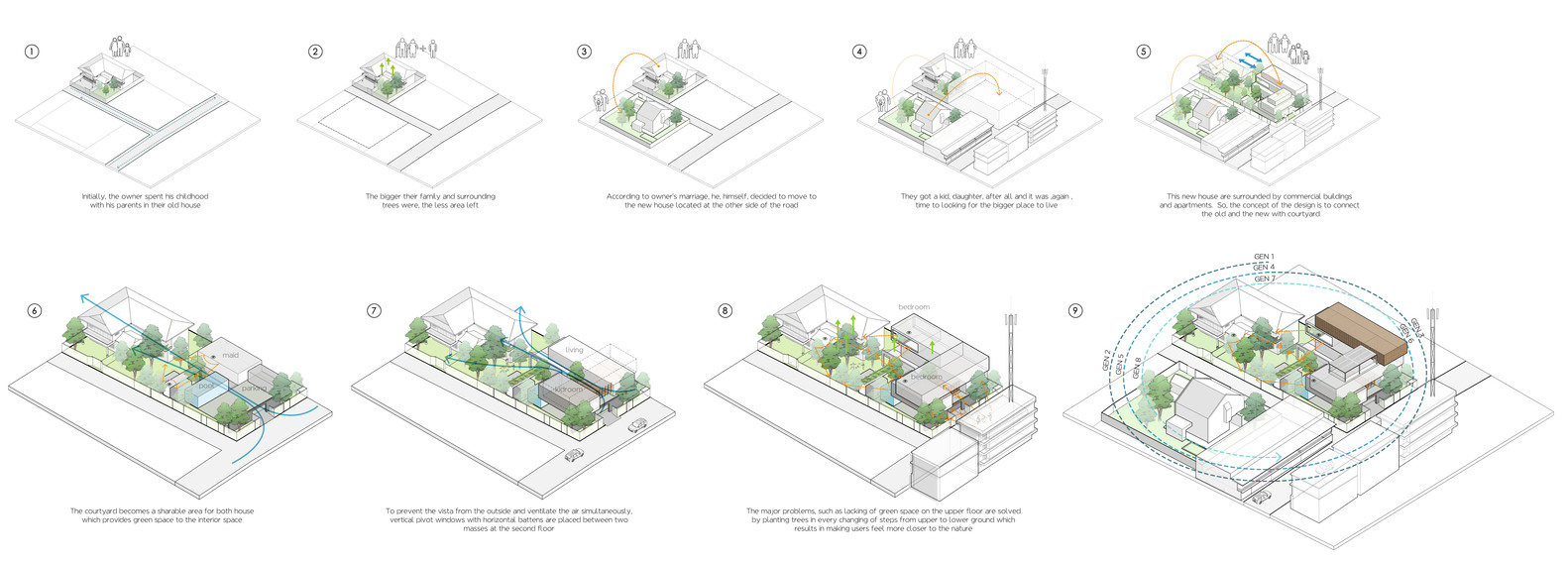 “เมื่อความอบอุ่นและผูกพันภายในครอบครัว เป็นเสมือนรากฐานของความคิดในการดำเนินชีวิตต่อไปในอนาคต” แรงบันดาลใจจากคุณปู่น้องมีนา ที่ทำให้นึกถึงสังคมไทยสมัยก่อน แนวคิดของการนำบ้านเรือนไทยมาใส่ในสไตล์แบบโมเดิร์นจึงเกิดขึ้น ภายในบ้านขนาด 4 ชั้น ที่มีพื้นที่ใช้สอยกว่า 1,726 ตารางเมตร วางผังอาคารแบบรูปตัว L เพื่อเปิดพื้นที่ระเบียงใหญ่ หรือ “ชานกลางบ้านแสนร่มรื่น” ที่เป็นดั่งจุดศูนย์รวมของทุกคนในบ้าน โดยคุณปู่คุณย่า สามารถมาทำกิจกรรมร่วมกับลูกหลานในพื้นที่นี้ได้ ซึ่งจะช่วยสร้างปฏิสัมพันธ์ระหว่างคนทั้งสามช่วงวัยได้เป็นอย่างดี
