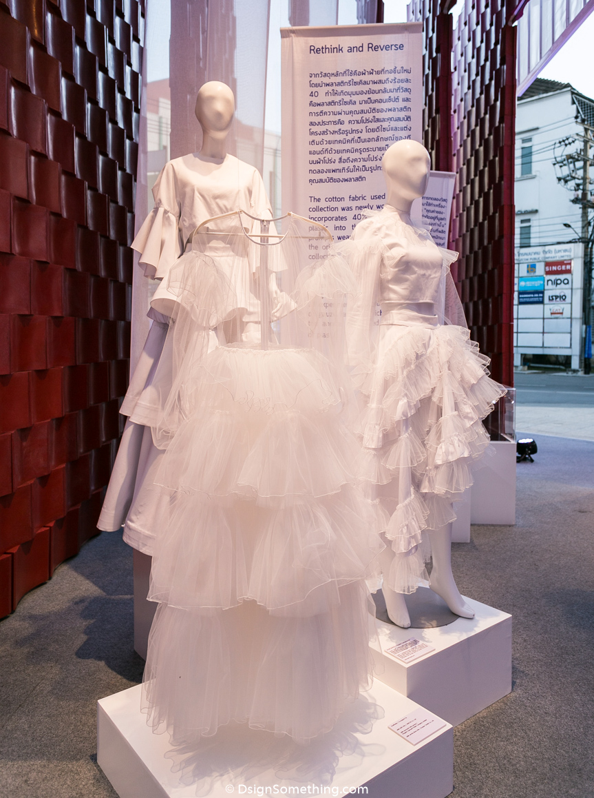 เสื้อผ้าและเครื่องแต่งกายที่ผลิตจากผ้าฝ้ายที่ทอขึ้นใหม่โดยผสมพลาสติกรีไซเคิลถึงร้อยละ 40 (ด้านซ้าย) และผลิตจากวัสดุเหลือใช้อย่าง ขวดพลาสติกและแหอวน (ด้านขวา)