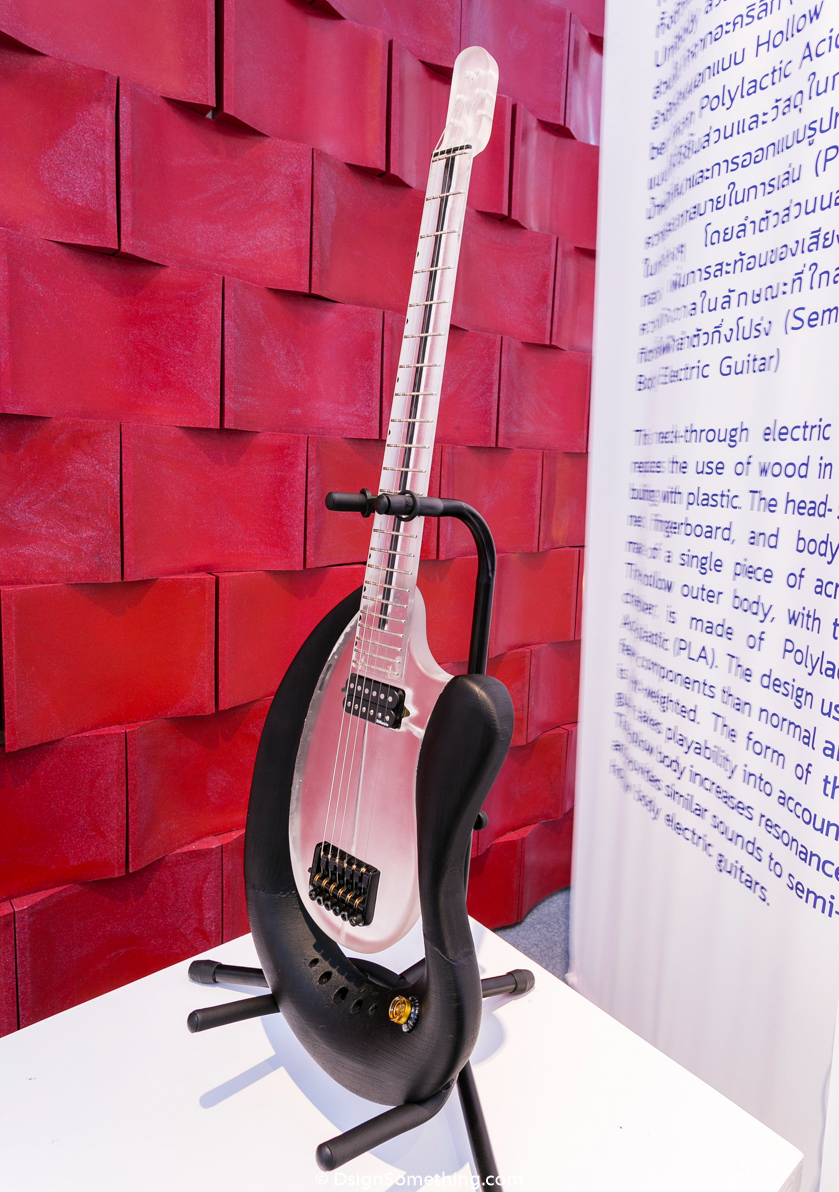 นอกจากด้านนอกที่โชว์ศักยภาพของพลาสติกในรูปแบบของงานสถาปัตยกรรมแล้ว ภายในยังมีงานจัดแสดงผลิตภัณฑ์ที่แปรรูปมาจากขยะพลาสติกอีกด้วย ซึ่งเป็นหนึ่งในวัสดุที่สร้างสรรค์ผลงานได้อย่างหลากหลาย ไม่ว่าจะเป็นเสื้อผ้า กระเป๋า โคมไฟ ไปจนถึงกีต้าร์ไฟฟ้าเลยทีเดียว