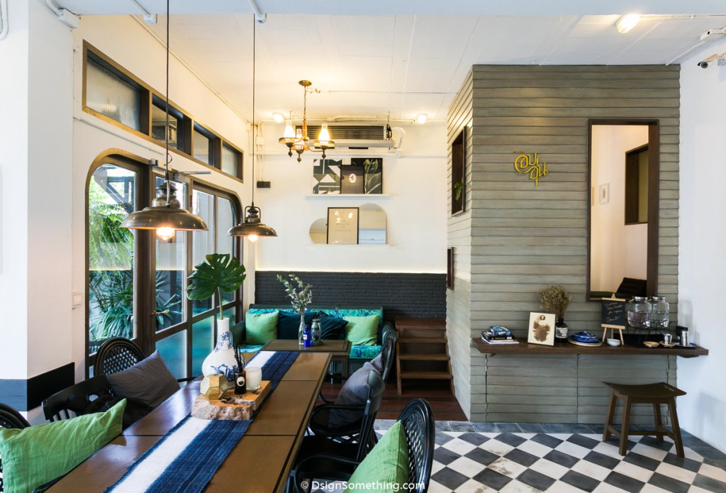 ส่วนของรีเซปชั่น คาเฟ่ โต๊ะรับประทานอาหาร จะอยู่บริเวณโถงต้อนรับในพื้นที่ชั้น 1 ซึ่งพื้นที่ตรงนี้สามารถเป็นได้ทั้งที่รับประทานอาหารเช้าของลูกค้าในตอนกลางวัน ที่พบปะพูดคุยแลกเปลี่ยนความคิดเห็นของผู้เข้าพัก หรือเป็นที่ประชุมลูกค้าของ Terra Architects ก็สามารถรองรับการใช้งานได้อย่างอเนกประสงค์และคุ้มค่ากับพื้นที่ ที่มีค่อนข้างจำกัด