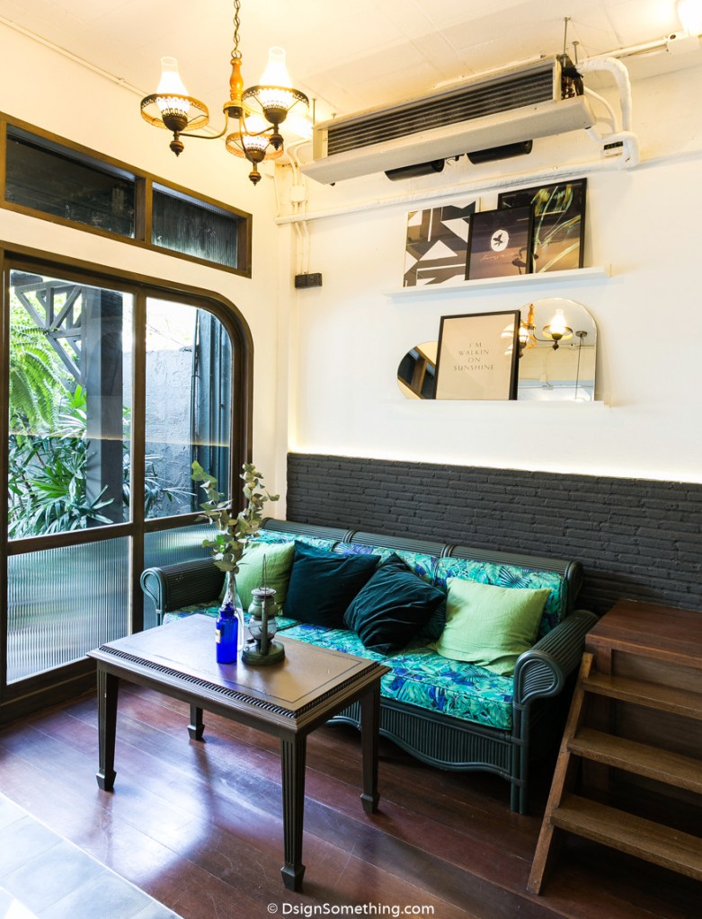 จะเห็นได้ว่าในพื้นที่โถงรับแขกมีการคุมโทนสีเขียวและน้ำตาลจากไม้เป็นสีหลัก มีช่องเปิดที่แสงธรรมชาติส่องถึงภายในห้อง อีกทั้งมีการนำของเก่ามาตกแต่ง เช่น โต๊ะ เก้าอี้ โคมไฟ รวมไปถึงของตกแต่งเล็กๆน้อยๆอย่างแจกันดอกไม้ หรือขวดยา มาประดับ เพื่อเป็นการสะท้อนแนวคิด บ้านคุณยาย ให้เห็นเด่นชัดมากขึ้น รวมทั้งเป็นการสร้างบรรยากาศ Feel like home ให้แขกผู้เข้าพักได้เกิดความประทับใจในการมาเยือนแต่ละครั้ง