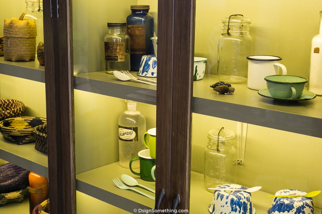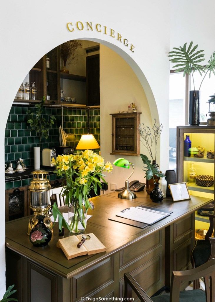 กระเบื้องสีเขียวสดที่อยู่หลังเคาน์เตอร์เช็คอิน เมื่อลองมองอย่างถี่ถ้วนแล้ว จะพบว่าเป็นกระเบื้องสระว่ายน้ำ ที่ผู้คนในสมัยก่อนนิยมนำมาปูเป็นผนังห้องครัวนี่เอง