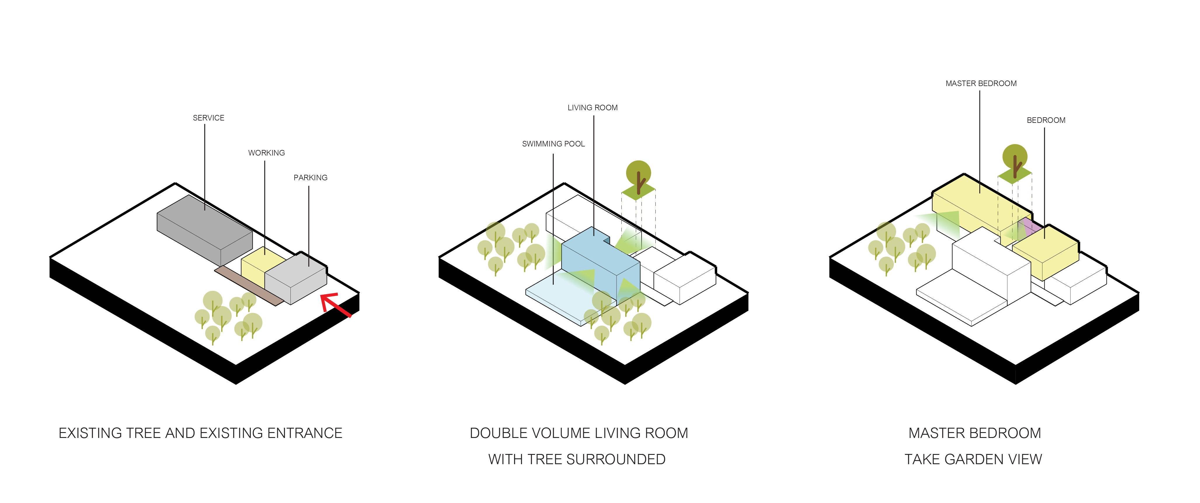 การออกแบบบ้าน PA House เริ่มต้นจากการสำรวจทิศทางแดดและลม เพื่อสร้างสภาวะน่าสบายให้กับผู้พักอาศัย จากนั้นจึงออกแบบบ้านตามการใช้งานที่เจ้าของบ้านเป็นผู้กำหนดโจทย์มา เช่น ต้องการพื้นที่เปิดโล่งกลางบ้าน มีสระว่ายน้ำตรงกลาง และจากทุกมุมมองภายในบ้านต้องมีต้นไม้ มีธรรมชาติ เพื่อทำให้เกิดความผ่อนคลาย และมีพื้นที่โปร่ง โล่งในบ้าน