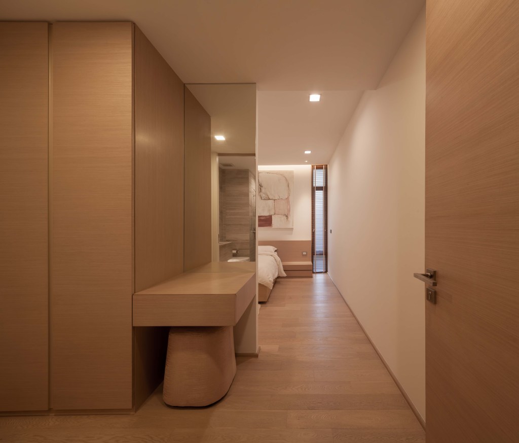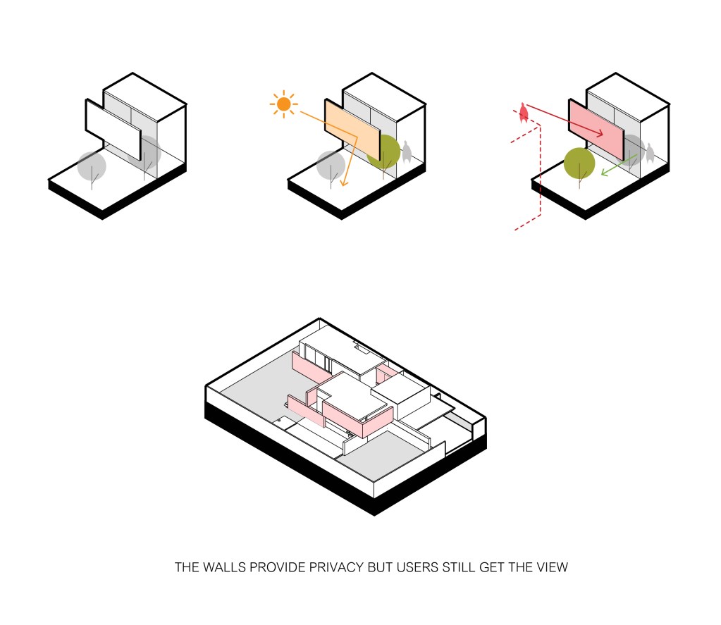 เมื่อจัดสรรการใช้งานภายในบ้านได้อย่างลงตัว ขั้นตอนต่อมาคือการสร้างความเป็นส่วนตัวให้กับผู้พักอาศัย คุณเป้จึงออกแบบผนัง (Plane) เพื่อบล็อควิวจากอาคารเพื่อนบ้านที่รอบล้อมบ้าน โดยในการออกแบบแต่ละ Plane จะถูกวิเคราะห์มาอย่างดีแล้วว่า การสร้าง Plane ในลักษณะนี้ สามารถกั้นสายตาจากคนภายนอกได้หรือไม่ และในขณะเดียวกันแต่ละ Plane ก็จะกลมกลืนไปกับผนังส่วนอื่นของบ้าน ผู้อยู่อาศัยจะไม่รู้สึกว่ามีผนังคอยปิดกั้นมุมมองเลยแม้แต่น้อย