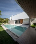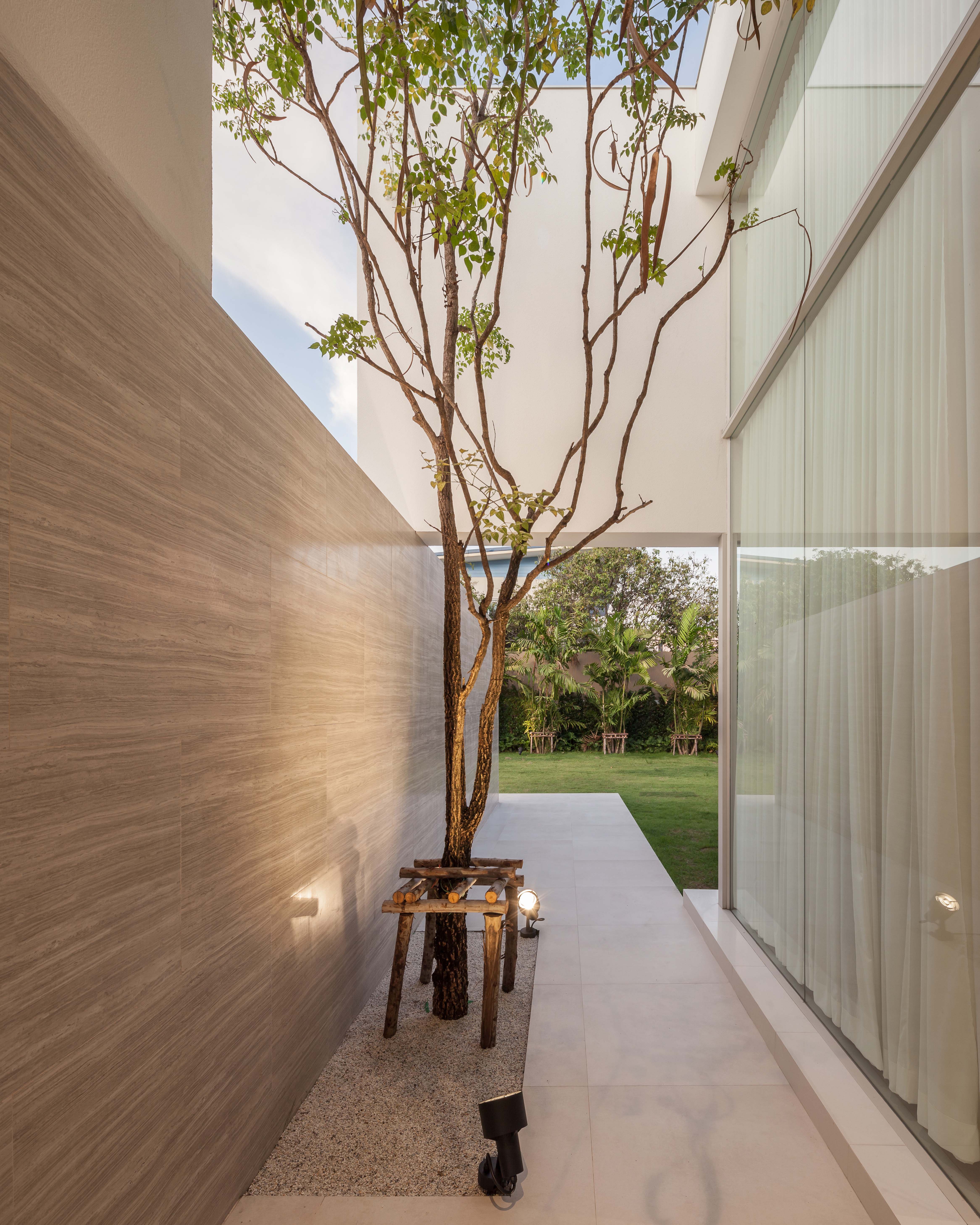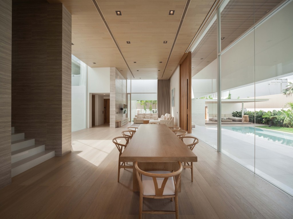 ไม้และกระจกช่วยลดความหนักของคอนกรีตสีขาว ให้ดูเบา สบายมากขื้น