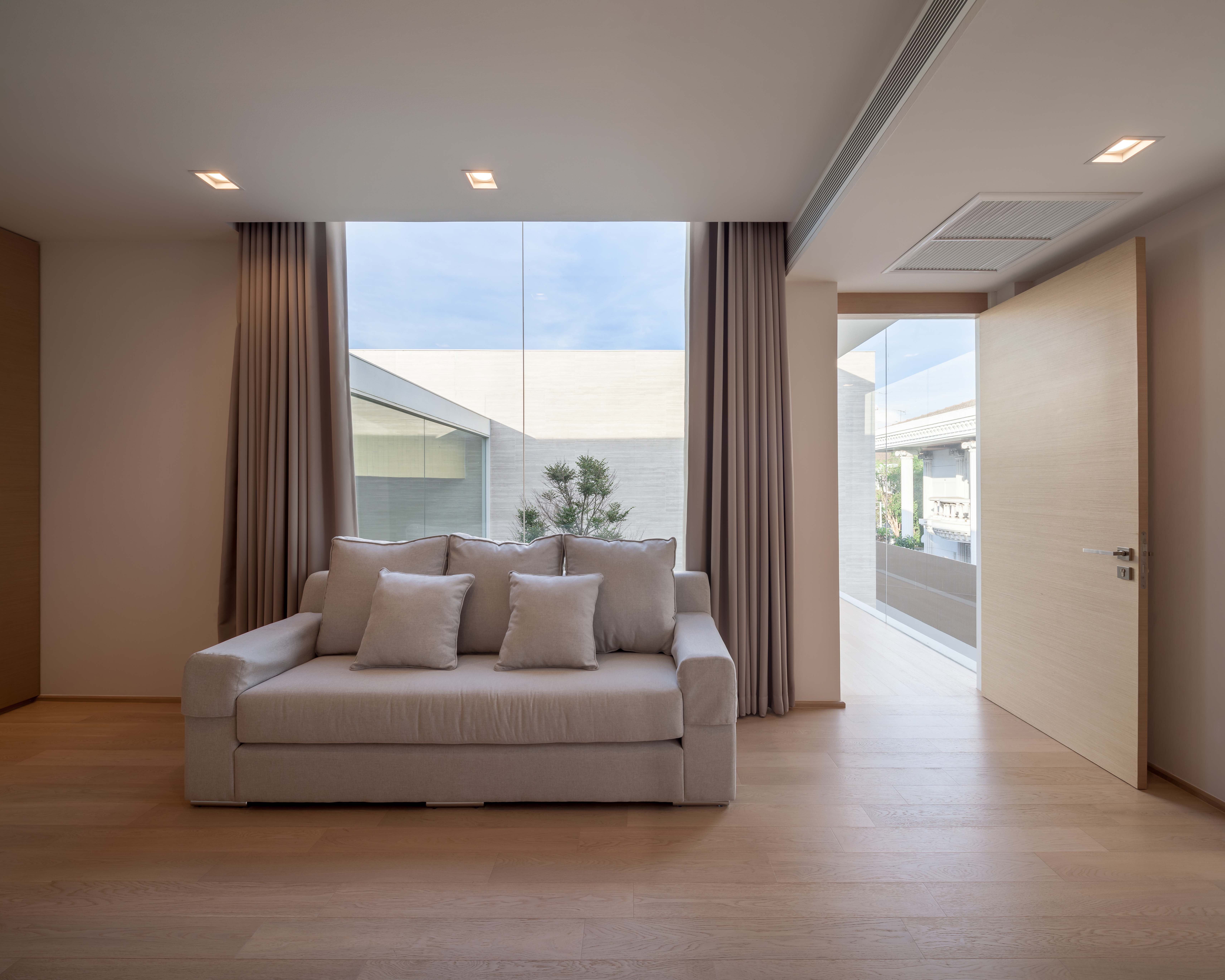 พื้นที่ภายในเป็นแบบ Double Volume มีกระจกสูงจนสุดฝ้าเพดาน และ Plane สีขาว จะอยู่ถัดมาข้างนอกจากกระจกอีกชั้นหนึ่ง Plane นี้ มีไว้เพื่อบังแดดและสามารถบล็อกวิวจากผู้คนภายนอกได้ อีกทั้งผู้พักอาศัยจะเห็นวิวได้กว้างและไกลมากขึ้น ก่อให้เกิดความรู้สึกที่โล่ง สบาย ไม่อึดอัดในการใช้งาน และในบางช่วงเวลาจะเห็นแสงเงาไล่จากข้างบนผนังลงมาที่พื้น ทำให้บ้านดูมีชีวิตชีวามากขึ้น