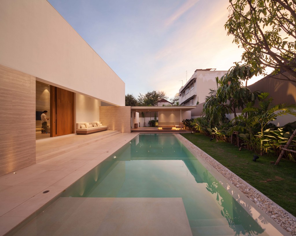 สระว่ายน้ำจะอยู่ในพื้นที่สวนกลางบ้าน วิวจากห้องนั่งเล่นจะสามารถมองเห็นสระว่ายน้ำและสวนได้