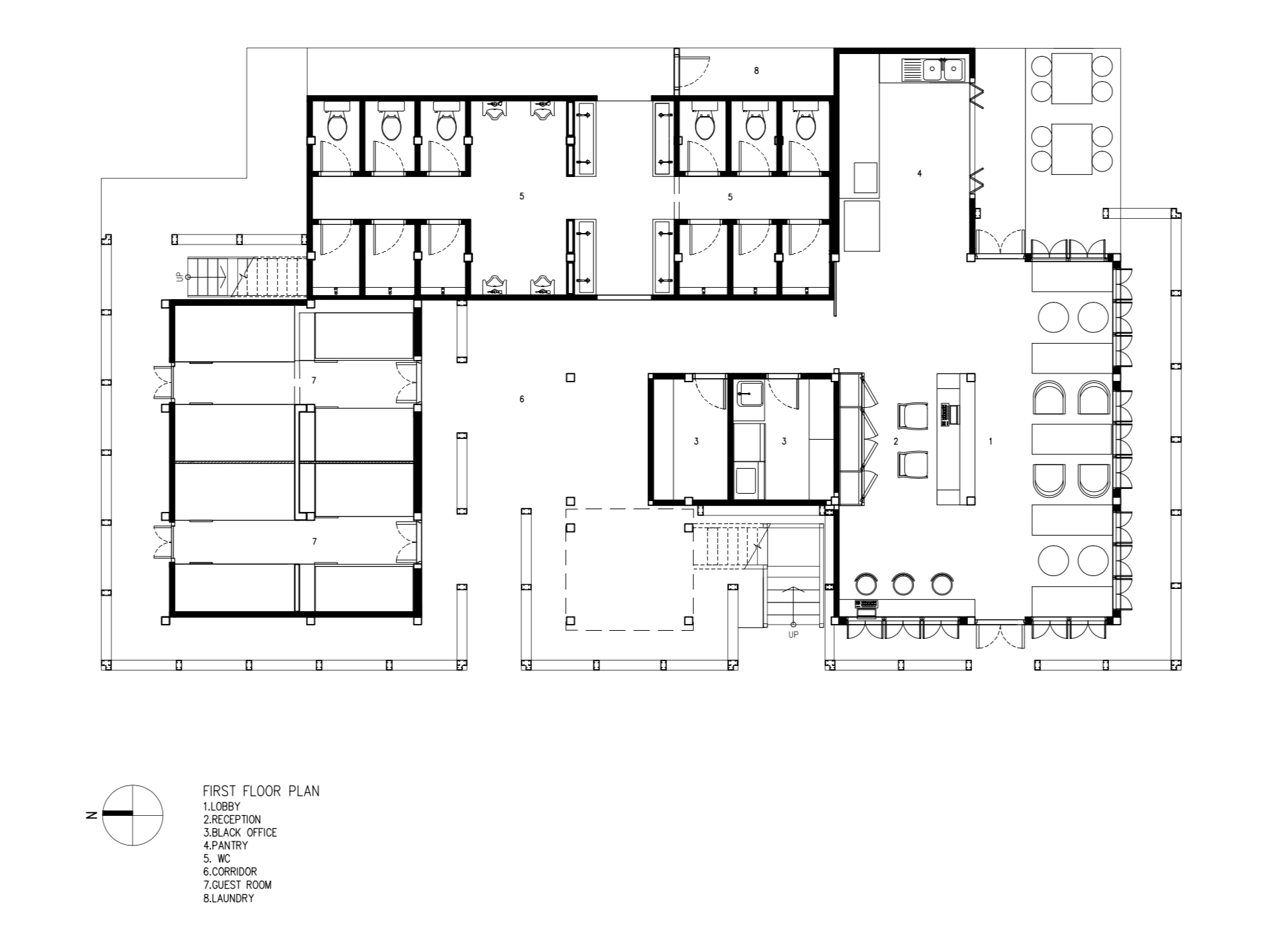 ชานบ้าน – เรือนไทยเปรียบดั่งวิถีชีวิตคนไทยในสมัยก่อน มีชานกลางบ้านที่ผู้พักอาศัยจะมานั่งรับประทานอาหารและใช้เวลาอยู่ร่วมกัน ส่วนห้องนอน ห้องน้ำ และห้องต่างๆจะถูกแยกกันอย่างชัดเจน สถาปนิกจึงนำรูปแรบบกาใช้งานเช่นนี้มาใช้ ด้วยการให้มีชานกลางบ้านเป็นพื้นที่ส่วนกลางและนั่งเล่นของผู้เข้าพัก มีห้องน้ำรวมซึ่งแยกตัวออกมาจากห้องนอน