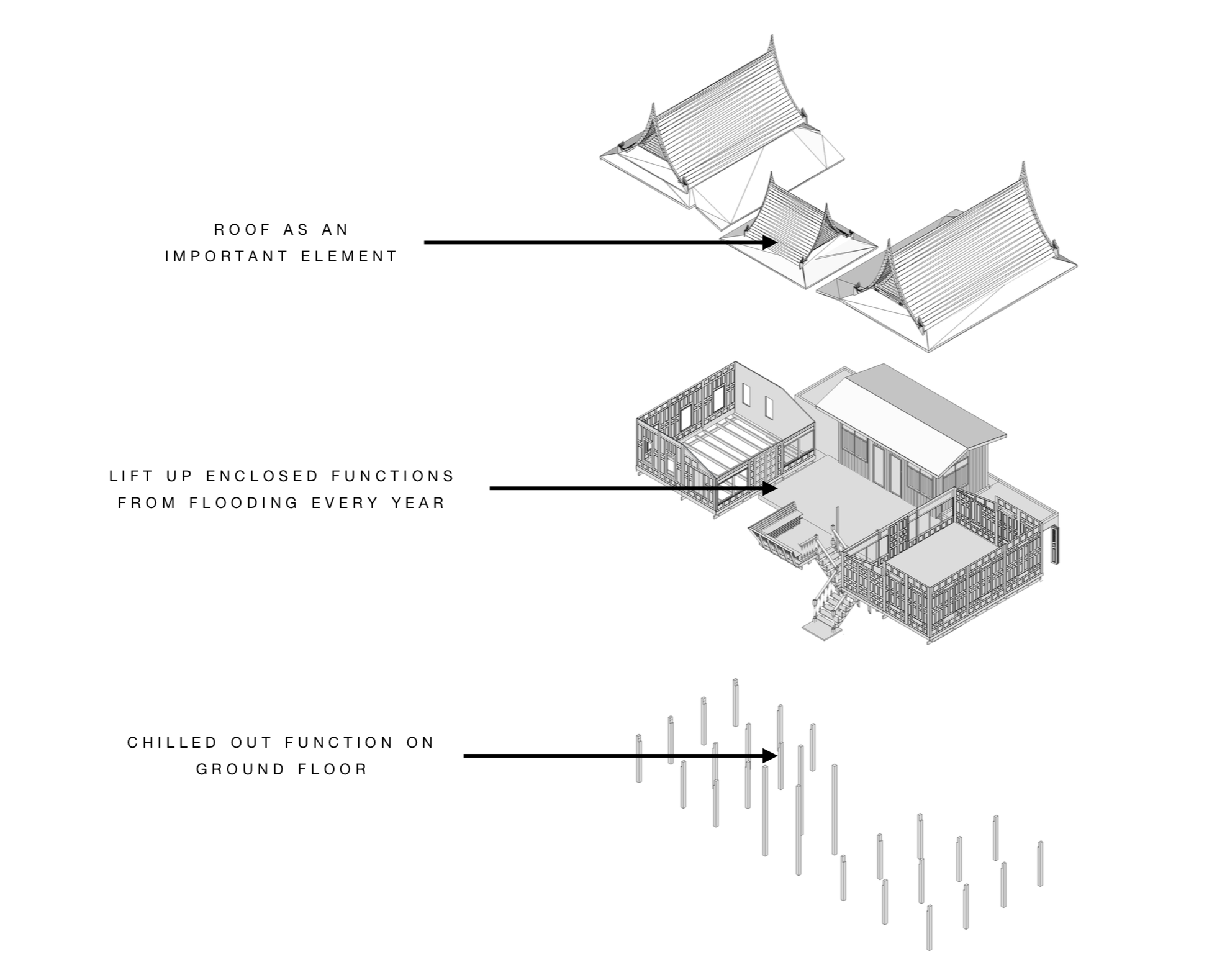 เมื่อได้รับโจทย์เรื่องการทำเรือนไทยให้เข้ากับยุคสมัยปัจจุบัน สถาปนิกจึงได้นำองค์ประกอบที่สำคัญของบ้านมาเรียบเรียงและตีความใหม่ ด้วยการนำลักษณะเด่นทั้ง 3 อย่างของเรือนไทย ได้แก่ หลังคาจั่ว การใช้พื้นที่ในบ้าน และฝาปะกน มาลดทอนเส้นสายสร้างความเรียบง่าย แต่เข้าถึงผู้คนได้อย่างหลากหลายมากขึ้น
