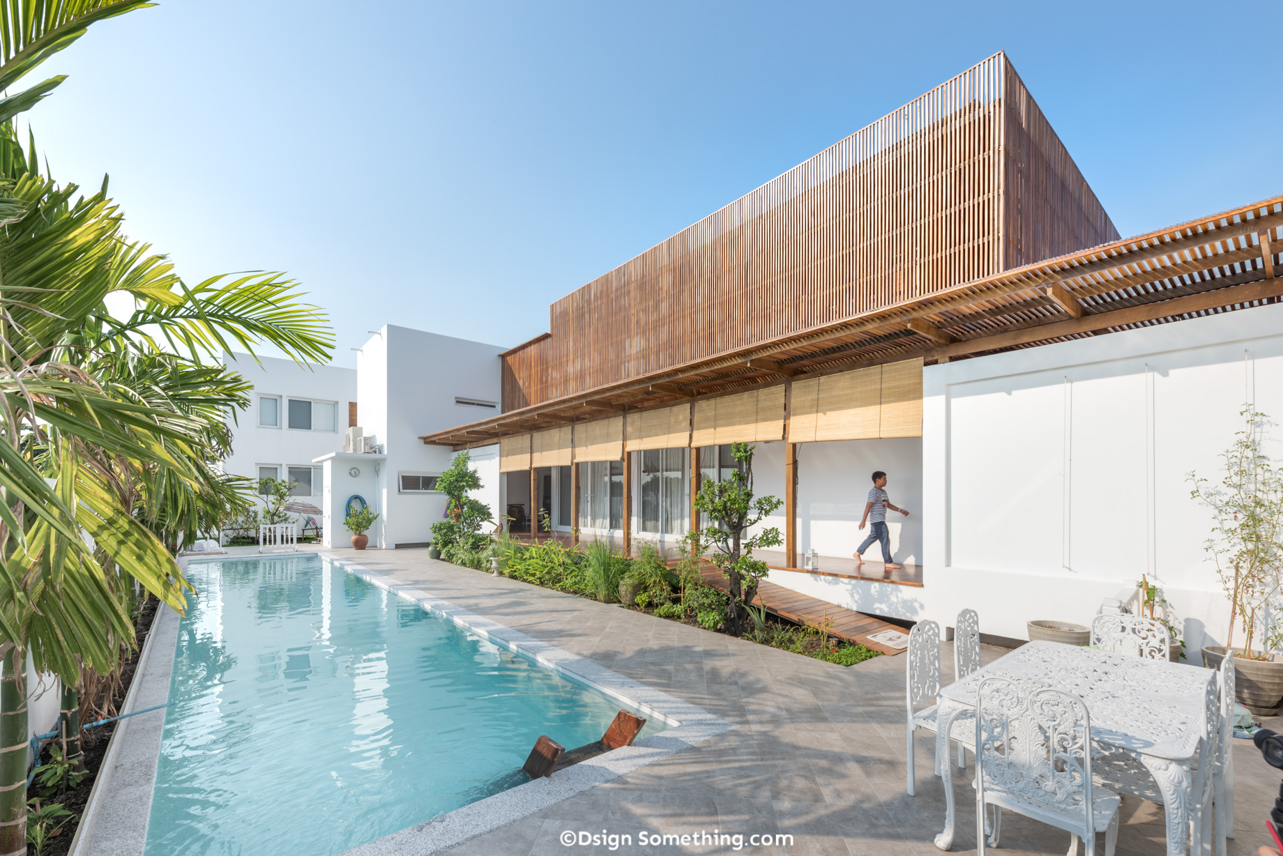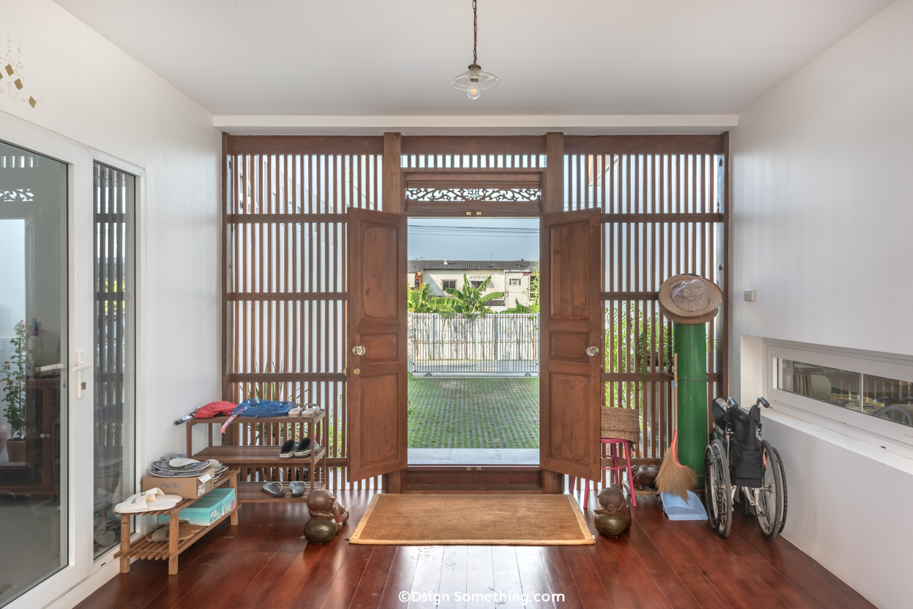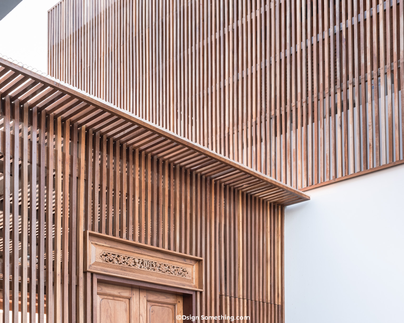 ระแนงไม้ใหม่ที่ออกแบบมาเพื่อโอบล้อมเรือนไทยเก่าเป็นภาษาทางสถาปัตยกรรมบ่งบอกความสำคัญของพื้นที่แห่งนี้ได้เป็นอย่างดี โดยทำหน้าที่สำคัญคือป้องกันแดดและลมที่จะกระทบเข้าสู่บ้านโดยตรง และสามารถบังสายตาจากภายนอกให้เกิดความกลมกลืนกับกลุ่มก้อนอาคารอื่นๆที่มีความโมเดิร์นตอบรับวิถีชีวิตใหม่ของคนในบ้าน