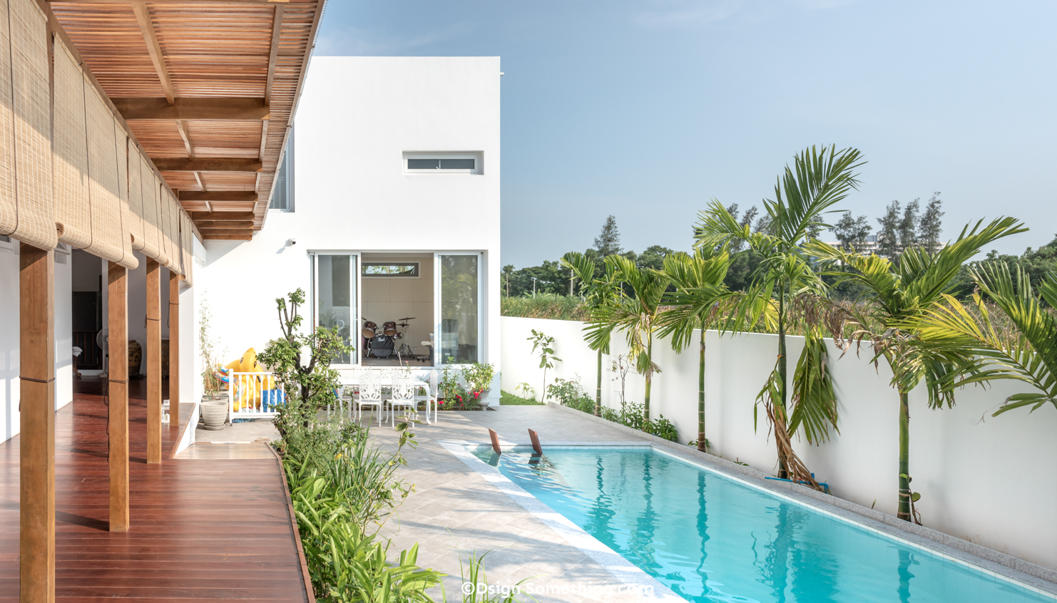 ภาพความเรียบง่ายของบ้านรูปทรงกล่องสี่เหลี่ยมสีขาวสไตล์โมเดิร์น และบรรยากาศที่อบอวลไปด้วยความอบอุ่นจากระแนงไม้ที่อยู่ใจกลางชั้นสองของบ้าน ใครจะคิดว่าภายในได้บรรจุ “บ้านเรือนไทย” พื้นที่แห่งความผูกพันที่เป็นหัวใจสำคัญของทุกคนในครอบครัวไว้ สถาปัตยกรรมโมเดิร์นที่ผสมผสานกับสถาปัตยกรรมไทยได้อย่างกลมกลืนนี้ เกิดขึ้นผ่านฝีมือการออกแบบของ “คุณป่อง ปฐมา หรุ่นรักวิทย์” สถาปนิกแห่ง Case Studio และเจ้าของบ้าน ที่ถ่ายทอดความต้องการของสมาชิกทุกคนไว้ได้อย่างลงตัว