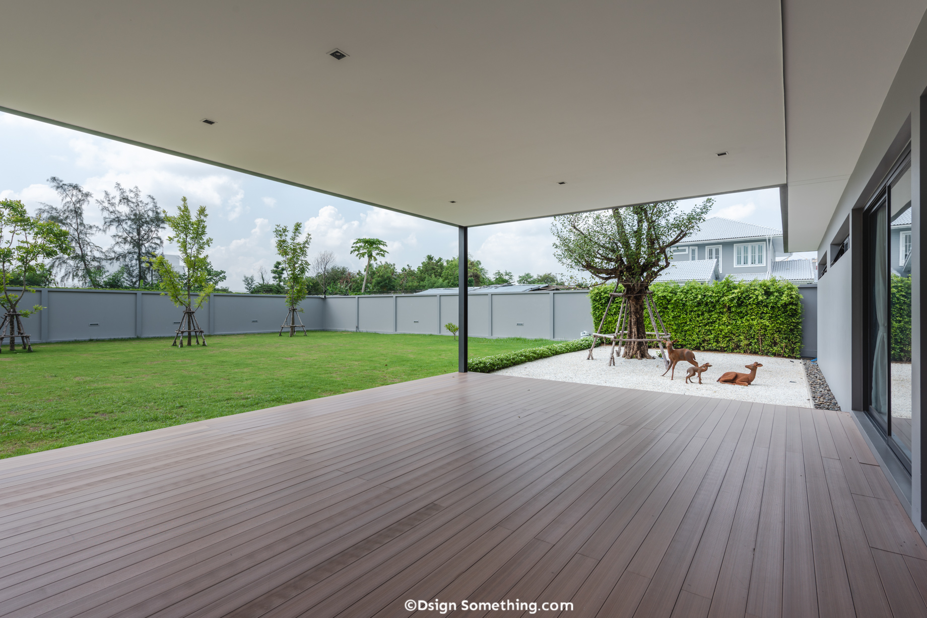 จากความชื่นชอบกีฬากอล์ฟของเจ้าของบ้าน จึงได้เลือกที่ดินติดสนามกอล์ฟแห่งหนึ่งในย่านรามอินทราเพื่อสร้างบ้านหลังใหม่ของครอบครัว เพราะนอกจากจะได้เล่นกีฬาที่โปรดปรานแล้ว ทัศนียภาพที่สวยงามของสนามกอล์ฟก็ชวนให้รู้สึกผ่อนคลายอยู่ไม่น้อย แต่ด้วยความใกล้สนามกอล์ฟมาก จึงมีปัจจัยเรื่องลูกกอล์ฟเพิ่มขึ้นมา กล่าวคือลูกกอล์ฟสามารถลอยเข้ามาในบริเวณบ้านได้ตลอดเวลา การแก้ปัญหานี้จึงเป็นโจทย์สำคัญในการออกแบบ ซึ่งคุณบิว มนัสพงษ์ สงวนวุฒิโรจนา สถาปนิกจาก Hypothesis คือผู้ที่จะแก้ไขโจทย์ชิ้นนี้นี่เอง