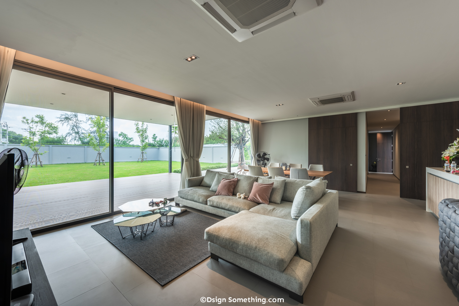 เมื่อเดินเข้ามาในบ้านจะพบกับส่วนนั่งเล่น ส่วนรับแขก ส่วนรับประทานอาหารและแพนทรีครัวเป็น Open Plan อยู่ใน บริเวณชั้น 1 ซึ่งพื้นที่ในส่วนนี้ จะมีความโล่ง โปร่ง มีกระจกขนาดใหญ่ เพื่อรับวิวธรรมชาติและสร้างมุมมองให้สามารถมองเห็นลูกสาวที่เล่นอยู่ตรงระเบียงหรือสวนภายนอกได้ สถาปนิกจึงออกแบบให้เสามีสแปนกว้างถึง 8 เมตร ช่วยให้ภายในพื้นที่รู้สึกโปร่งมากขึ้น ส่วนห้องนอนสำหรับแขก ห้องครัวไทย และส่วนเซอร์วิสจะอยู่บริเวณด้านหลังห้องรับแขก มีผนังเบาเคลื่อนที่ได้ แบ่งแยกพื้นที่ให้เป็นส่วนตัวมากยิ่งขึ้น