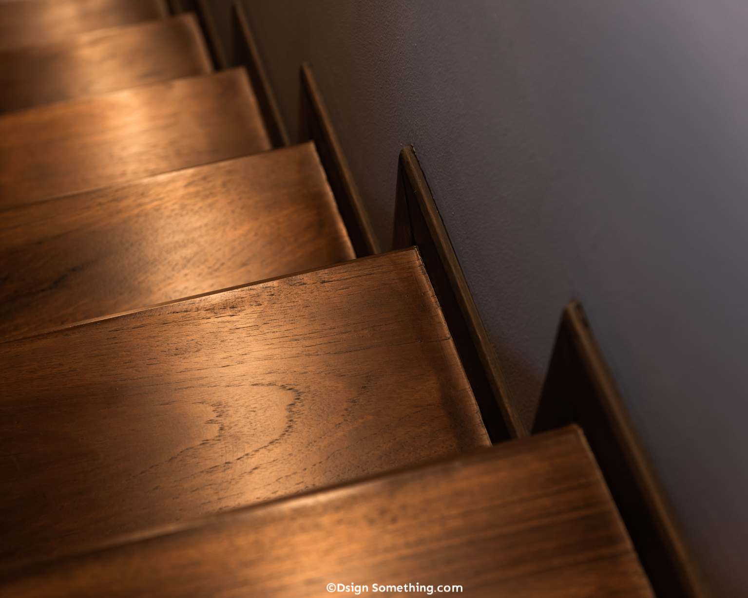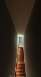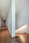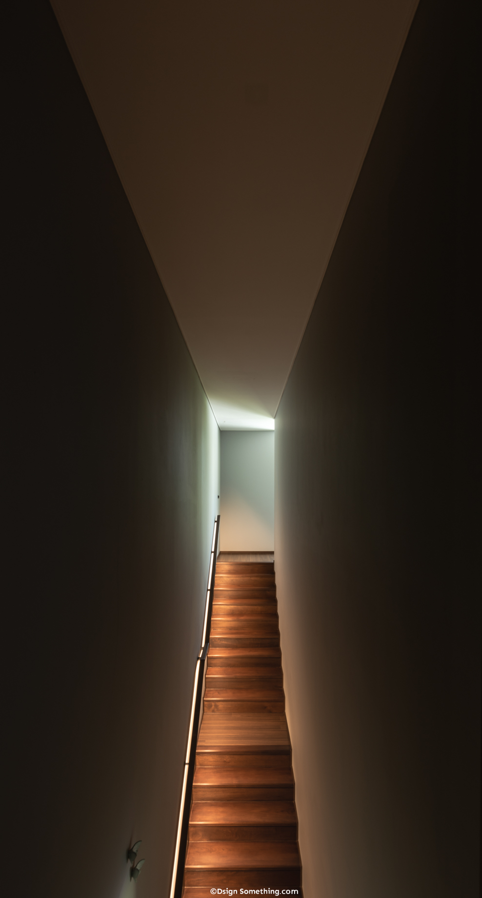 เมื่อเดินผ่านห้องนั่งเล่นจะพบกับบันไดที่ขึ้นไปสู่ชั้น 2 โดยบันไดตรงนี้สถาปนิกออกแบบให้มีลักษณะค่อนข้างมืด แต่มีแสงสว่างจากสุดทางบันได เพื่อเป็นจุดนำสายตาจากชั้น 1 ขึ้นไปยังบริเวณพื้นที่ชั้น 2