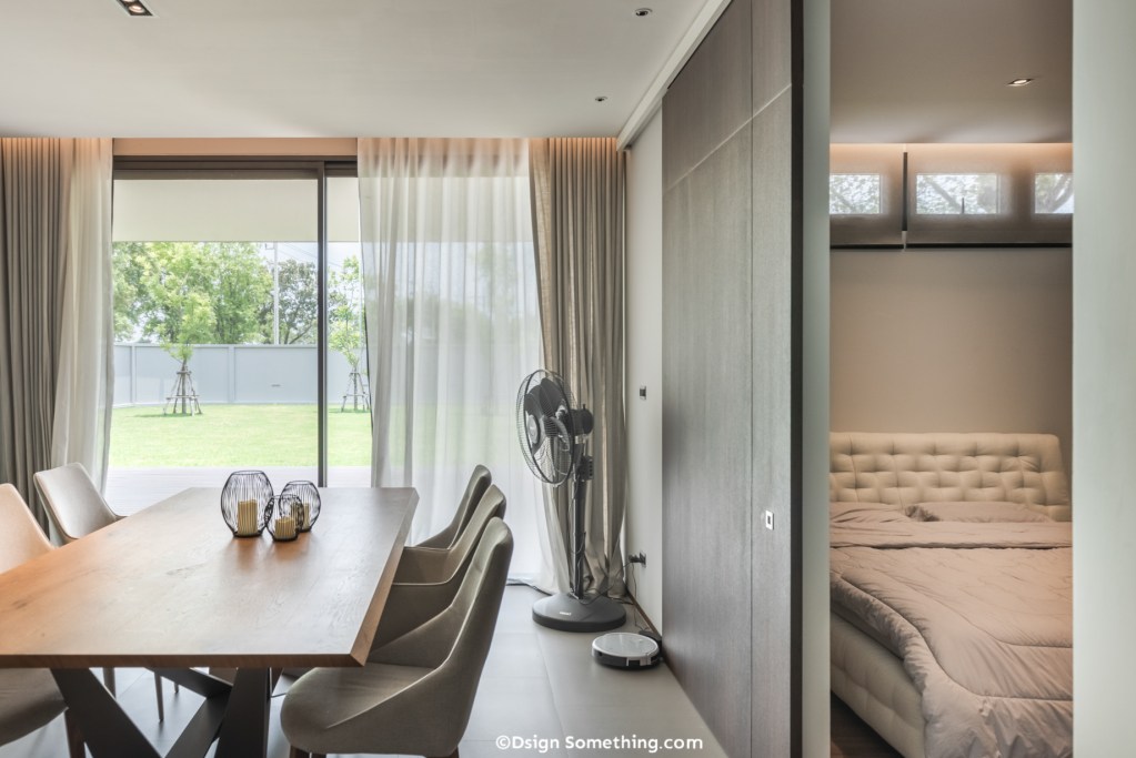 ห้องนอนใหญ่และห้องทำงานจะเป็นห้องที่มีทิวทัศน์สวยงามที่สุดในบ้าน เมื่อมองทะลุกระจกและ Façade อะลูมิเนียม จะเห็นวิวสนามกอล์ฟ สนามหญ้า และธรรมชาติอยู่รอบๆตัว