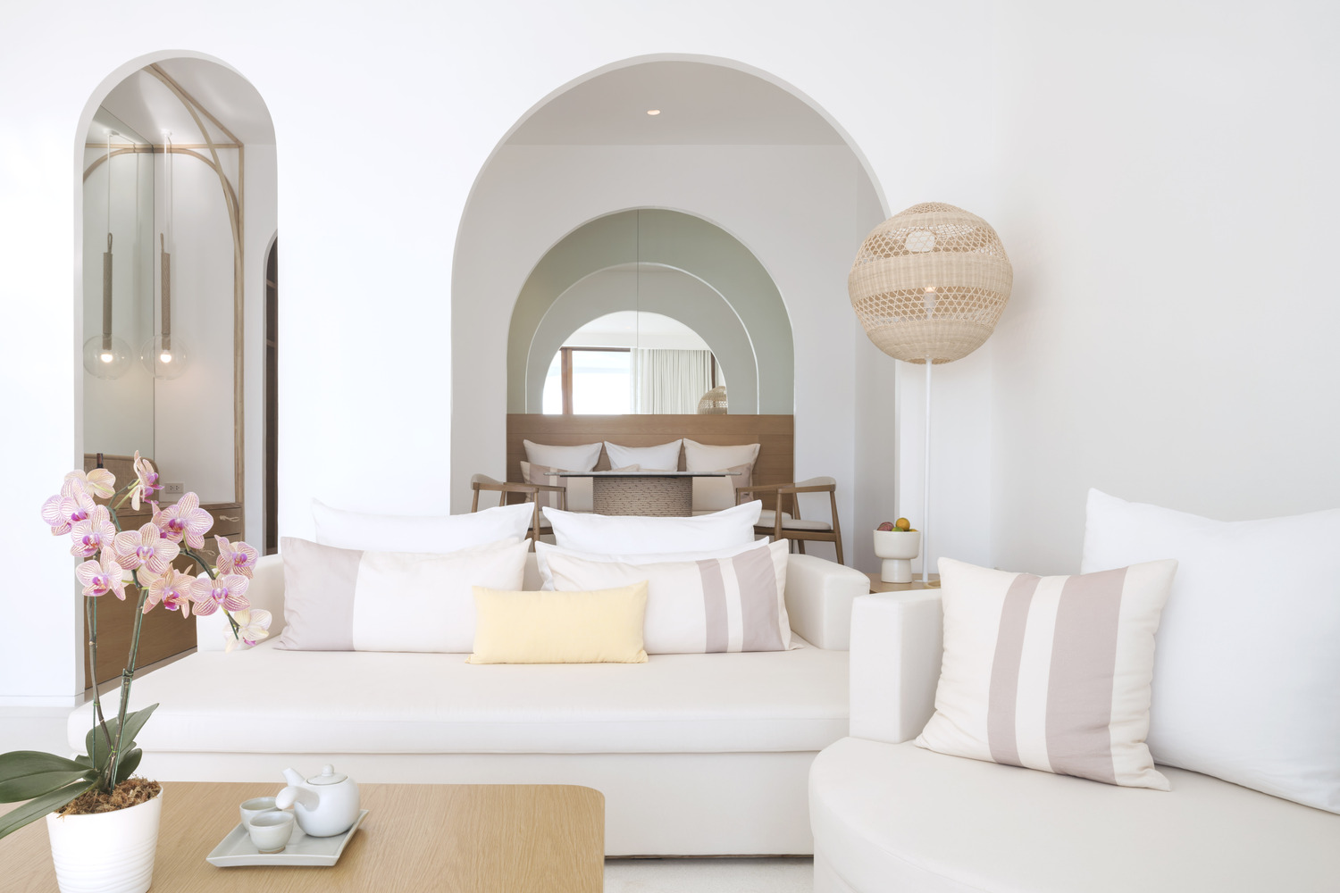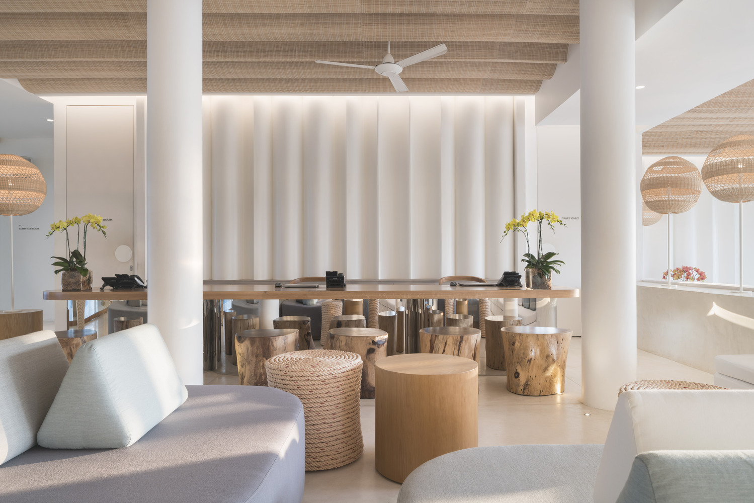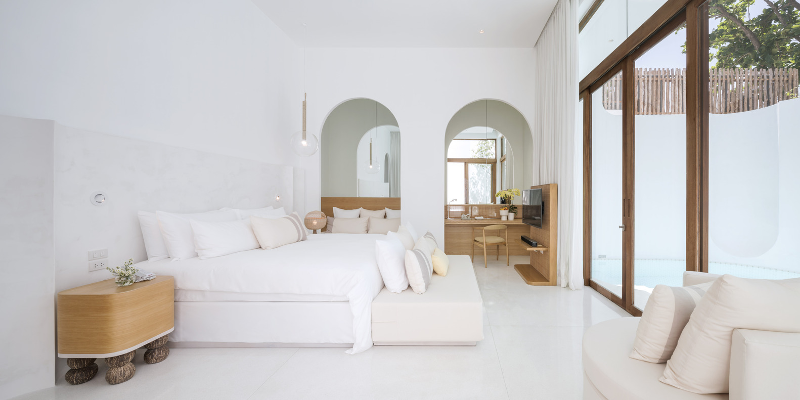 รวมถึงการเจาะช่องโค้งในส่วนการออกแบบภายในห้องพักแต่ละห้อง เพื่อสร้างลำดับการเข้าถึงด้วยเลเยอร์ของผนังเจาะช่องโค้ง ทำให้รู้สึกถึงความแตกต่างการเปลี่ยนผ่านพื้นที่ และแบ่งสัดส่วนให้พื้นที่มีความชัดเจนในการใช้งาน ในขณะที่ยังเชื่อมต่อกันผ่านสายตาไปสู่ท้องทะเลที่สวยงาม โดยลักษณะความโค้งทั้งหมดจัดองค์ประกอบความสวยงามแบบ Random ทำให้แต่ละห้องพักมีคาแรกเตอร์ที่แตกต่างกัน
