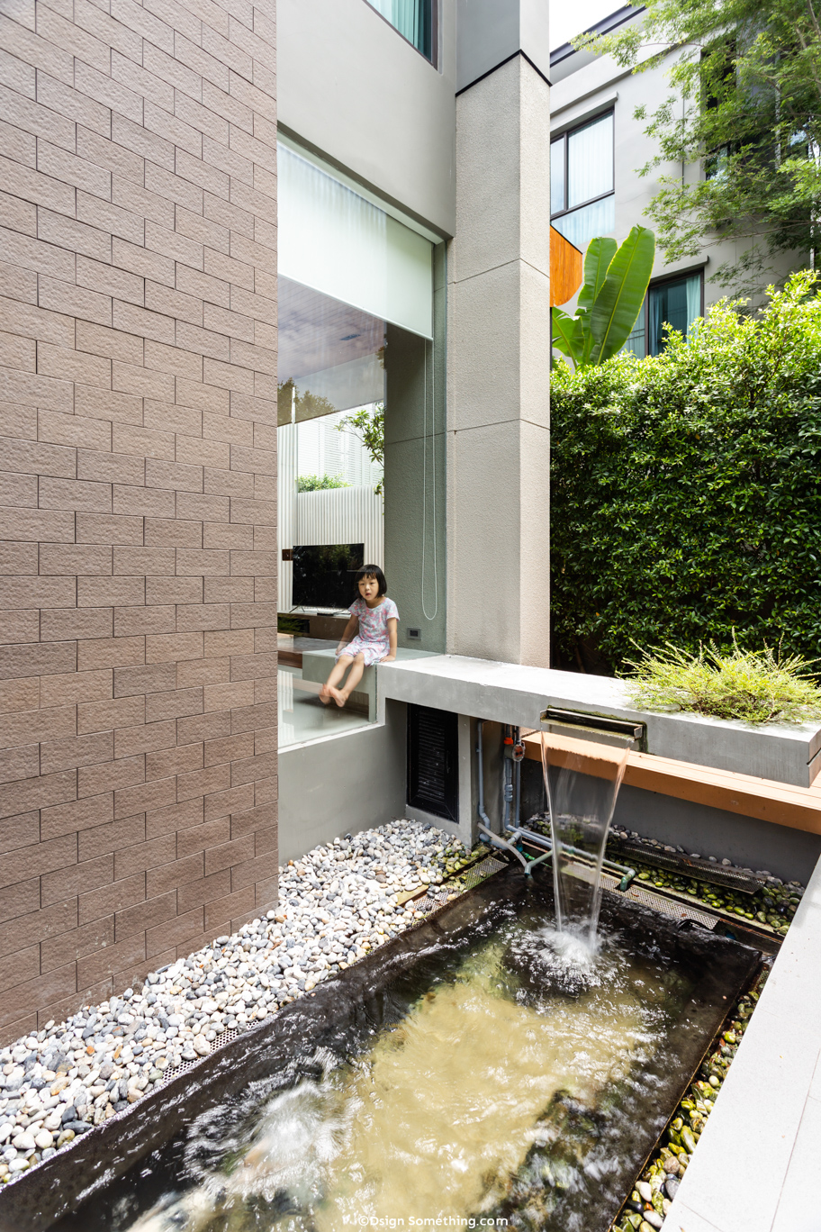 “บ่อปลาคราฟ” หนึ่งในความต้องการที่เป็นโจทย์สำหรับการออกแบบ ซึ่งตามหลักแล้วบ่อปลาคราฟที่ดีควรอยู่ในทิศที่มีแดดส่องผ่านมากที่สุด ซึ่งสำหรับบ้านนี้ไม่ใช่ทิศหลังบ้านตามภาพที่สถาปนิกตั้งใจไว้ แต่กลับเป็นทิศหน้าบ้านที่มีข้อจำกัดโครงสร้างกำแพงเก่าของบ้านจัดสรรที่ไม่สามารถเปลี่ยนแปลงได้