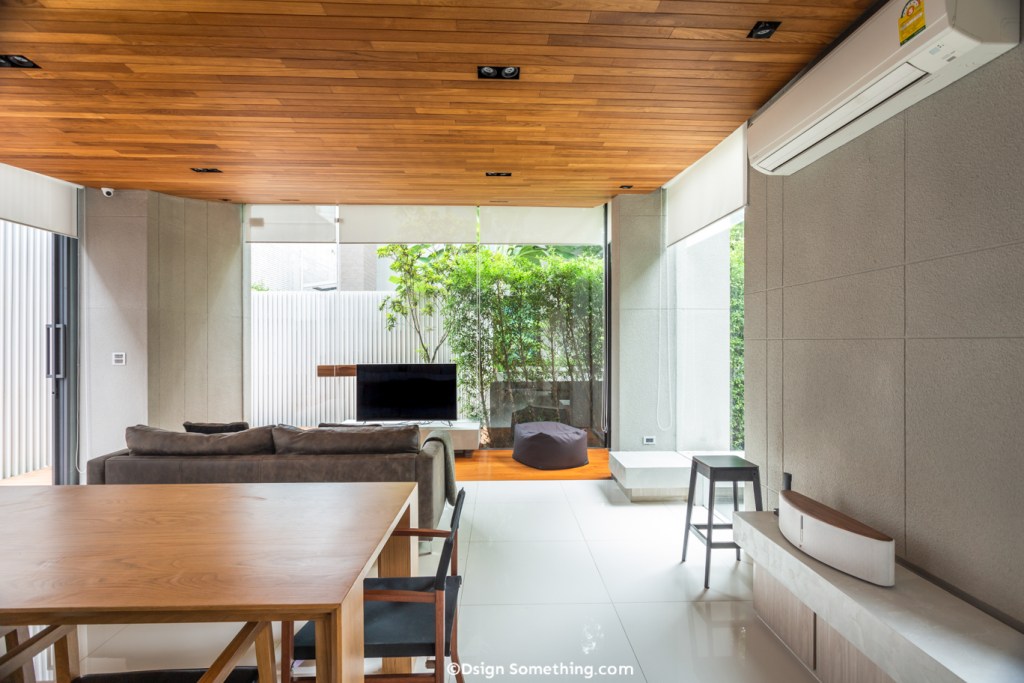 นอกจากนี้ยังมีการใช้วัสดุไม้ต่อเนื่องจากภายนอก เข้าสู่พื้นที่ด้านในเป็นแนวยาวบริเวณชั้นวางทีวี ในมูทแอนด์โทนเดียวกันได้อย่างกลมกลืน