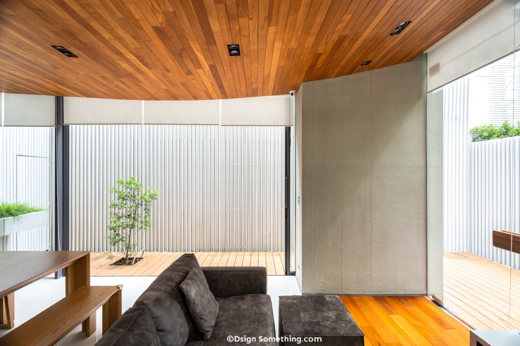 ในส่วนด้านหลังของบ้าน พื้นที่ภายในห้องนั่งเล่นที่สามารถเปิดกระจกกว้างเพื่อเชื่อมต่อพื้นที่ไปยังระเบียงหลังบ้านได้ มีต้นไม้ขนาดเล็กที่กำลังเติบโตไปพร้อมๆกับน้องจีน และเส้นสายของระแนงไม้สีขาววางสลับตั้งและนอน เพื่อให้เกิดจังหวะรูปแบบใหม่ในขณะที่ทอดสายตาผ่าน