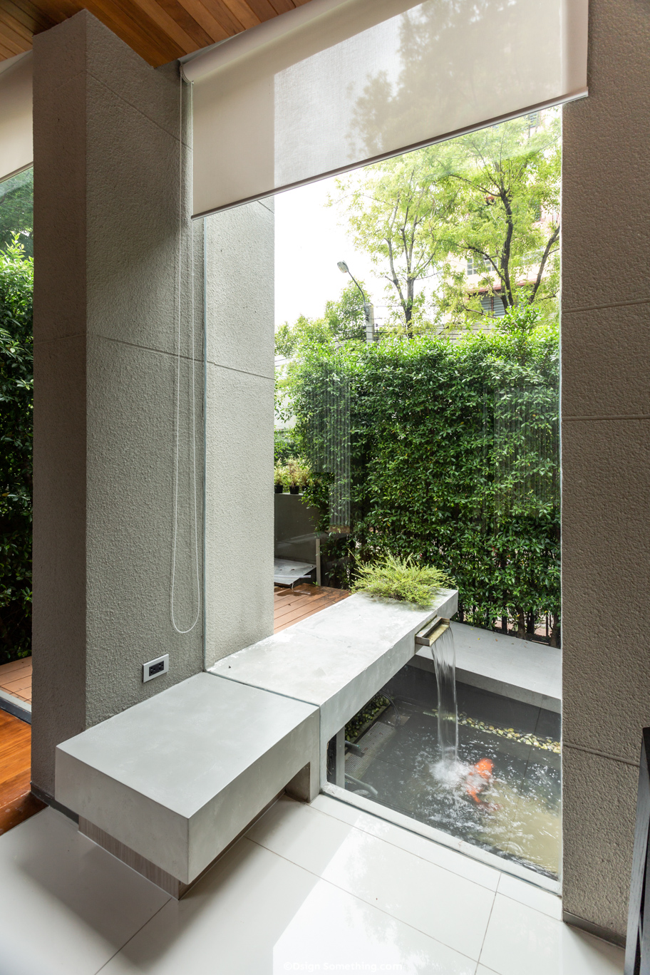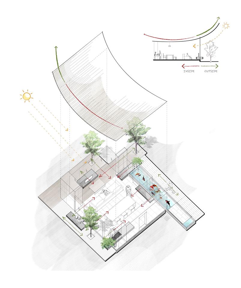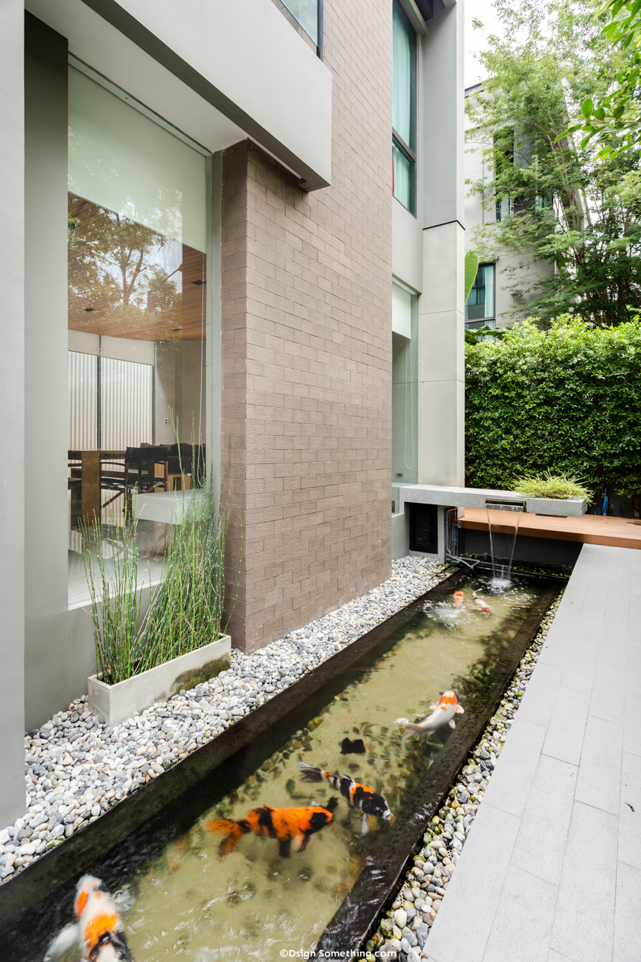 “บ่อปลาคราฟ” หนึ่งในความต้องการที่เป็นโจทย์สำหรับการออกแบบ ซึ่งตามหลักแล้วบ่อปลาคราฟที่ดีควรอยู่ในทิศที่มีแดดส่องผ่านมากที่สุด ซึ่งสำหรับบ้านนี้ไม่ใช่ทิศหลังบ้านตามภาพที่สถาปนิกตั้งใจไว้ แต่กลับเป็นทิศหน้าบ้านที่มีข้อจำกัดโครงสร้างกำแพงเก่าของบ้านจัดสรรที่ไม่สามารถเปลี่ยนแปลงได้
