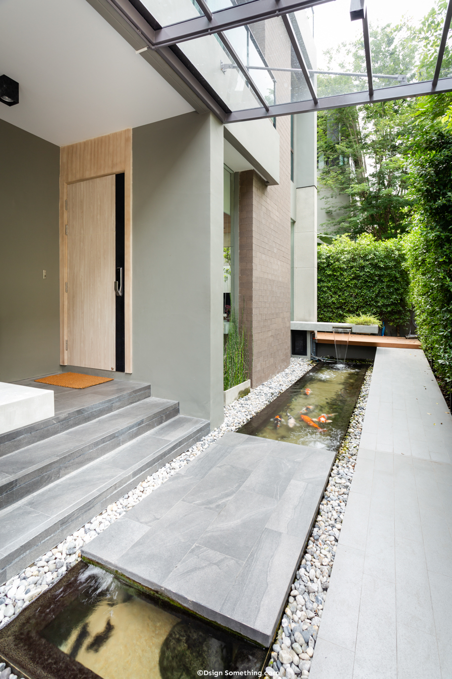 แผ่นหินทางเดินสีดำ เสมือนถูกวางลอยอยู่บนบ่อปลา ทำหน้าที่ต้อนรับผู้อยู่อาศัยและผู้มาเยือนก่อนเข้าถึงประตูด้านในบ้าน ซึ่งในทุกๆครั้งที่เดินผ่านเข้าออกบ้านน้น จะทำให้เกิดประการณ์ รับรู้ถึงการมีอยู่ของบ่อปลานี้มากขึ้น
