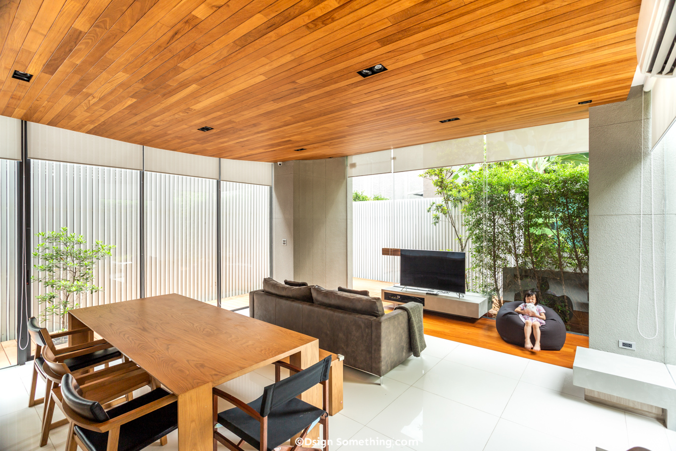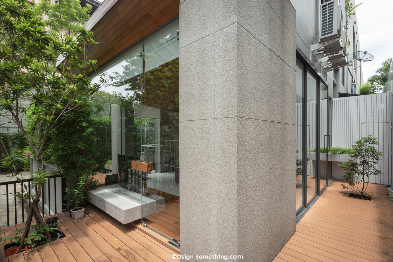 ในส่วนด้านหลังของบ้าน พื้นที่ภายในห้องนั่งเล่นที่สามารถเปิดกระจกกว้างเพื่อเชื่อมต่อพื้นที่ไปยังระเบียงหลังบ้านได้ มีต้นไม้ขนาดเล็กที่กำลังเติบโตไปพร้อมๆกับน้องจีน และเส้นสายของระแนงไม้สีขาววางสลับตั้งและนอน เพื่อให้เกิดจังหวะรูปแบบใหม่ในขณะที่ทอดสายตาผ่าน