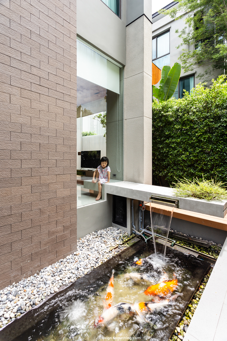 “บ่อปลาคราฟ” หนึ่งในความต้องการที่เป็นโจทย์สำหรับการออกแบบ ซึ่งตามหลักแล้วบ่อปลาคราฟที่ดีควรอยู่ในทิศที่มีแดดส่องผ่านมากที่สุด ซึ่งสำหรับบ้านนี้ไม่ใช่ทิศหลังบ้านตามภาพที่สถาปนิกตั้งใจไว้ แต่กลับเป็นทิศหน้าบ้านที่มีข้อจำกัดโครงสร้างกำแพงเก่าของบ้านจัดสรรที่ไม่สามารถเปลี่ยนแปลงได้